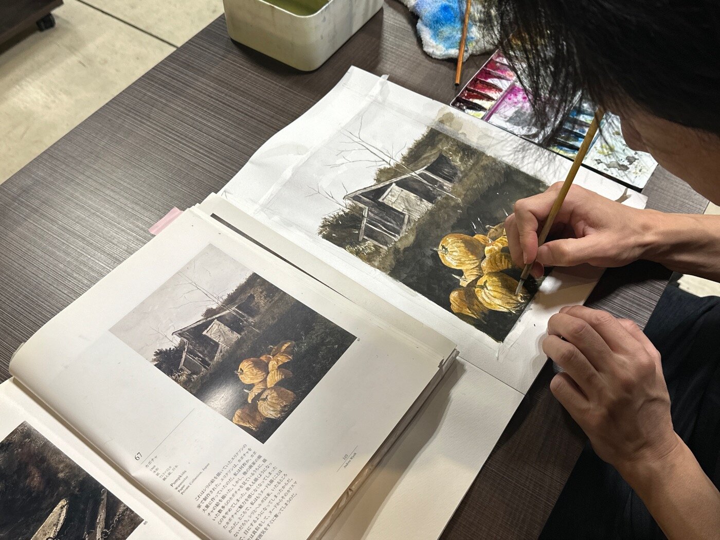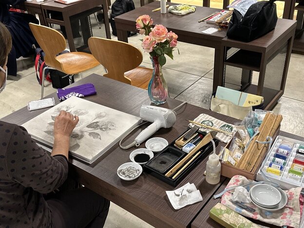 進み具合も1教室の3時間で1枚を完成させる方や、展覧会等に向けて3ヶ月ほどじっくり描かれる方までおられます。