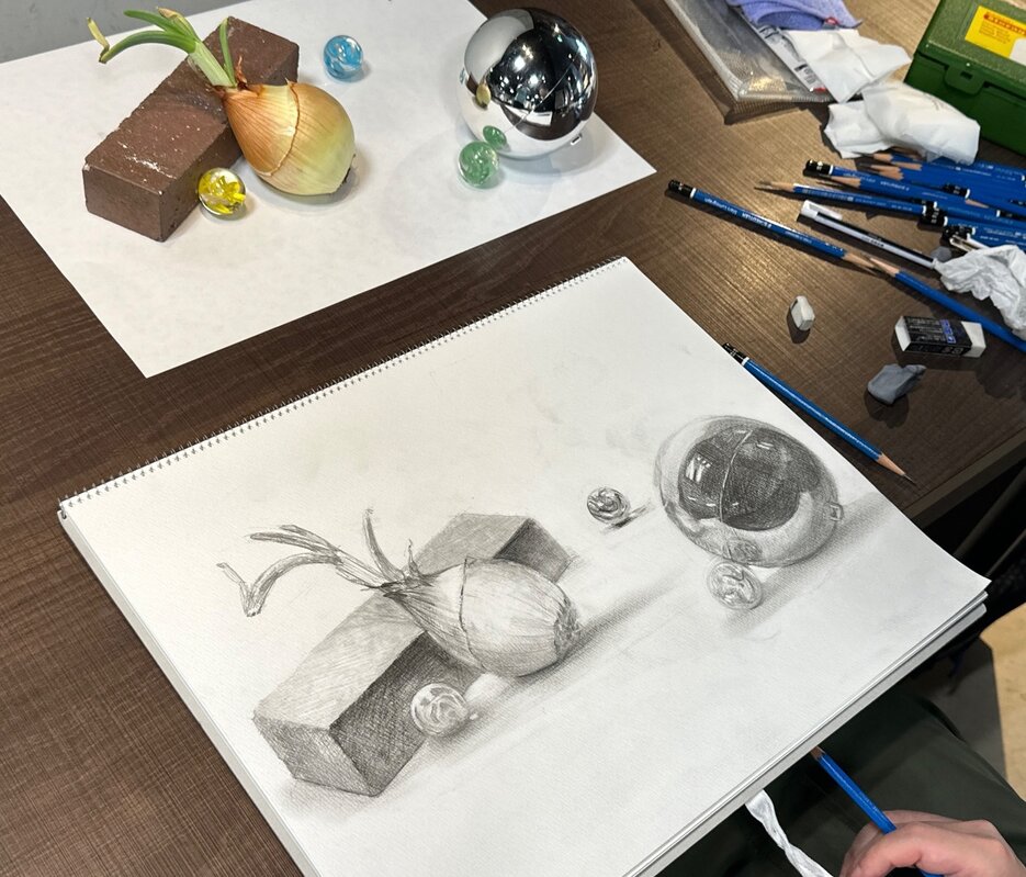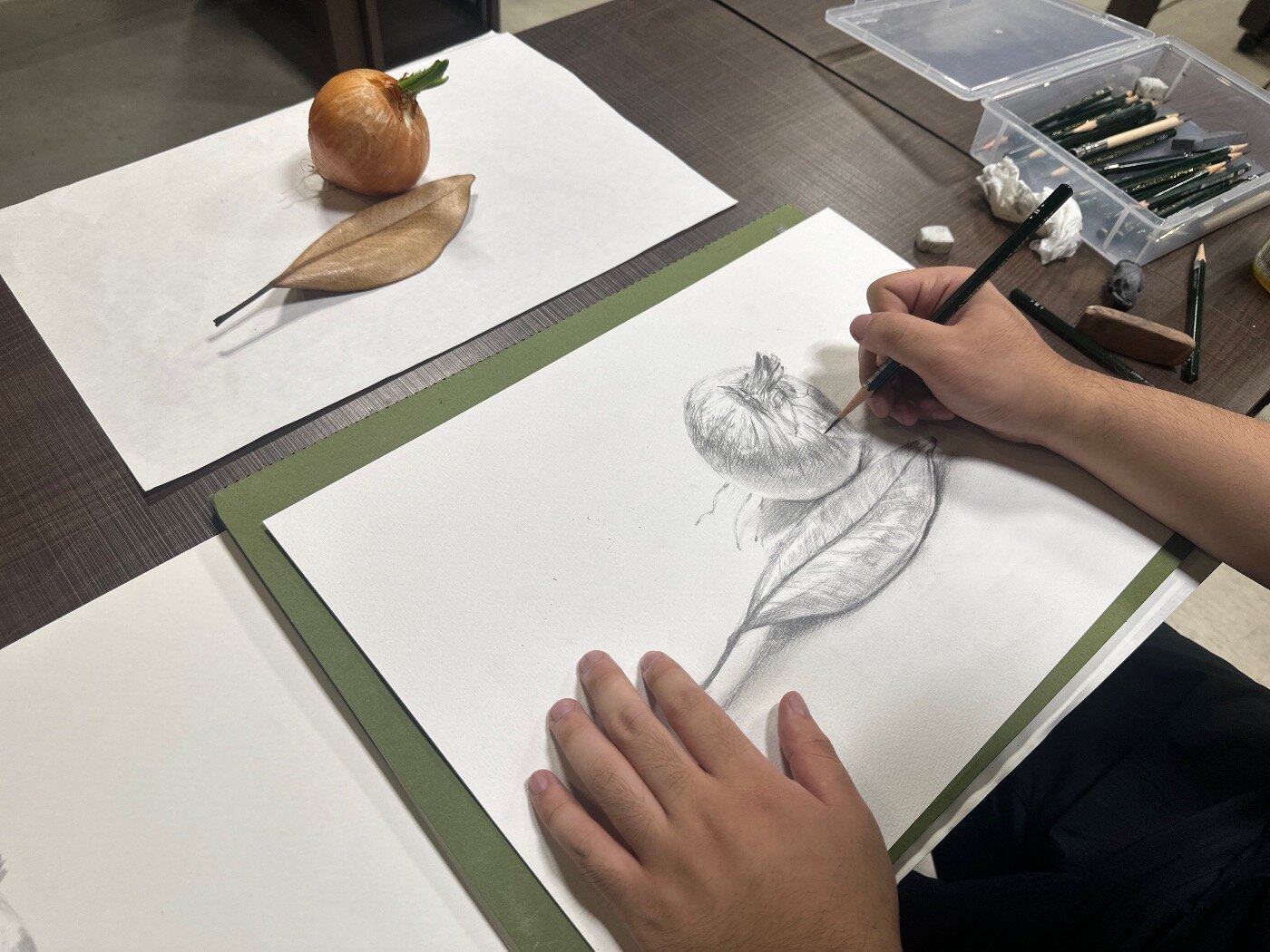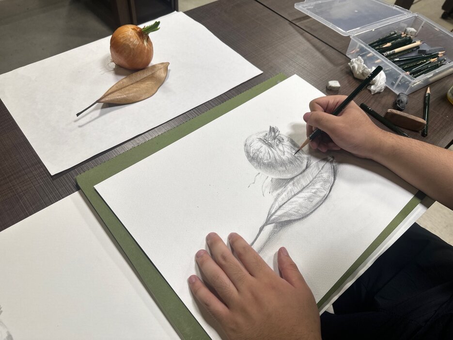 写真上の生徒さんは、タマネギと落ち葉のデッサンを描かれています。