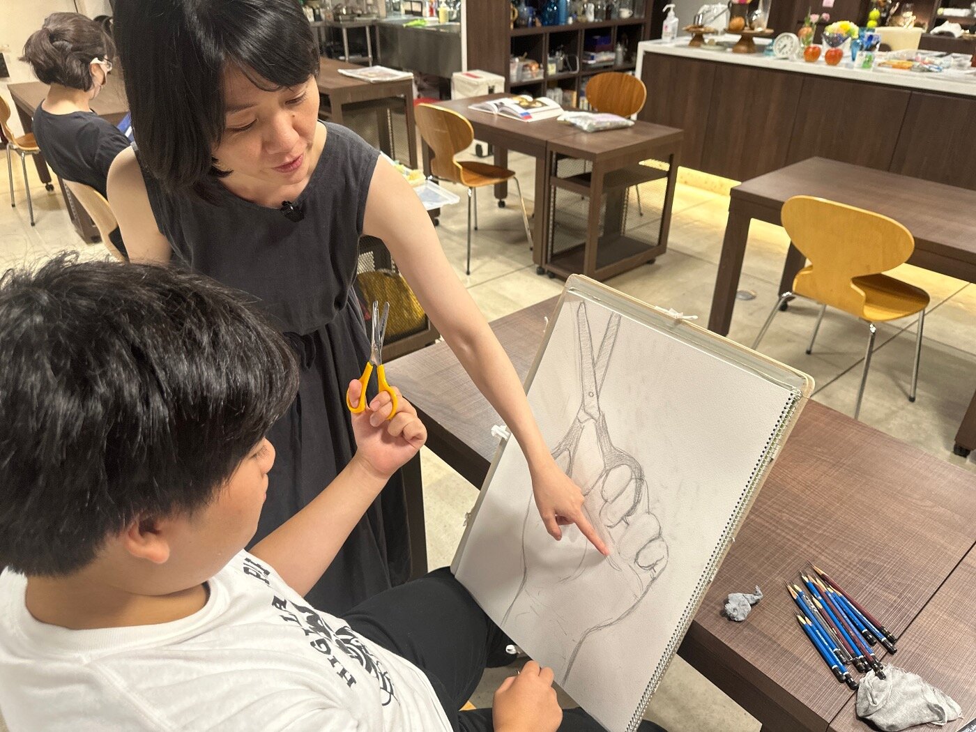 鉛筆デッサンの必要なポイントを丁寧に解説されている場面です。