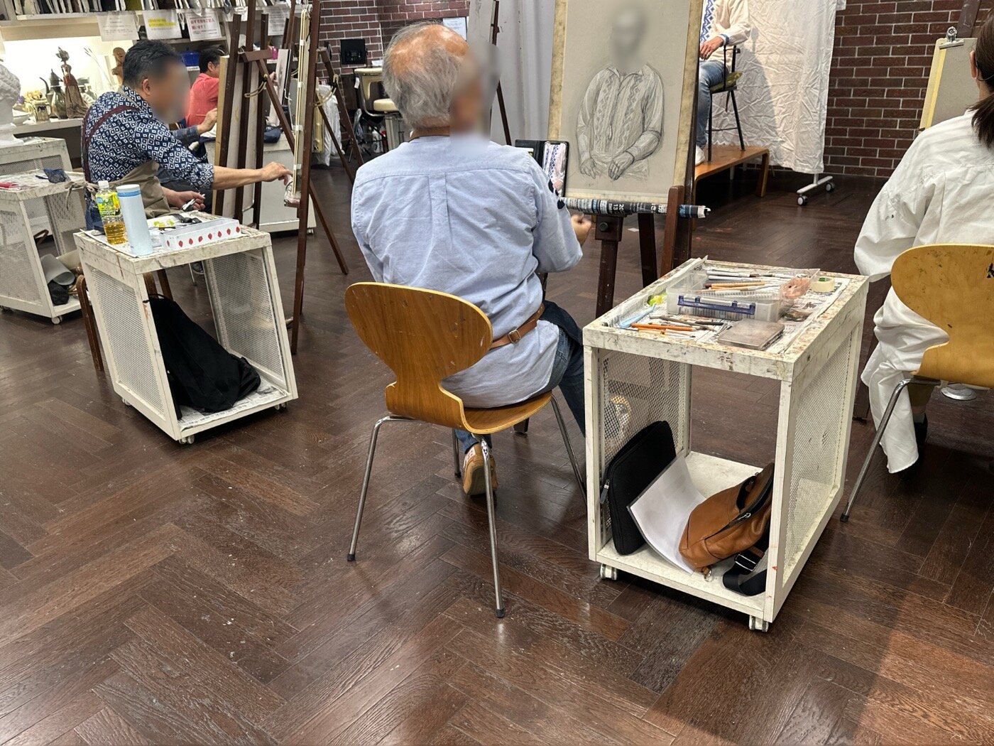 1人のモデルさんを写真のように囲んでイーゼルで制作をします。