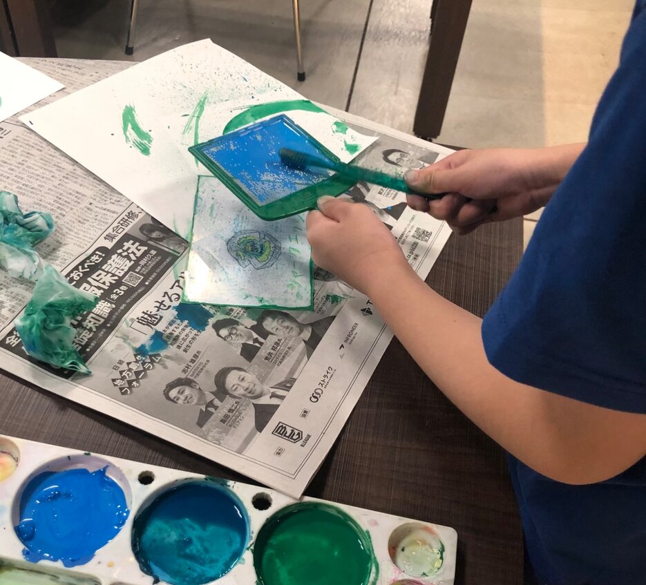 網に筆で絵の具を塗ってから、歯ブラシでこする方法でもできます。