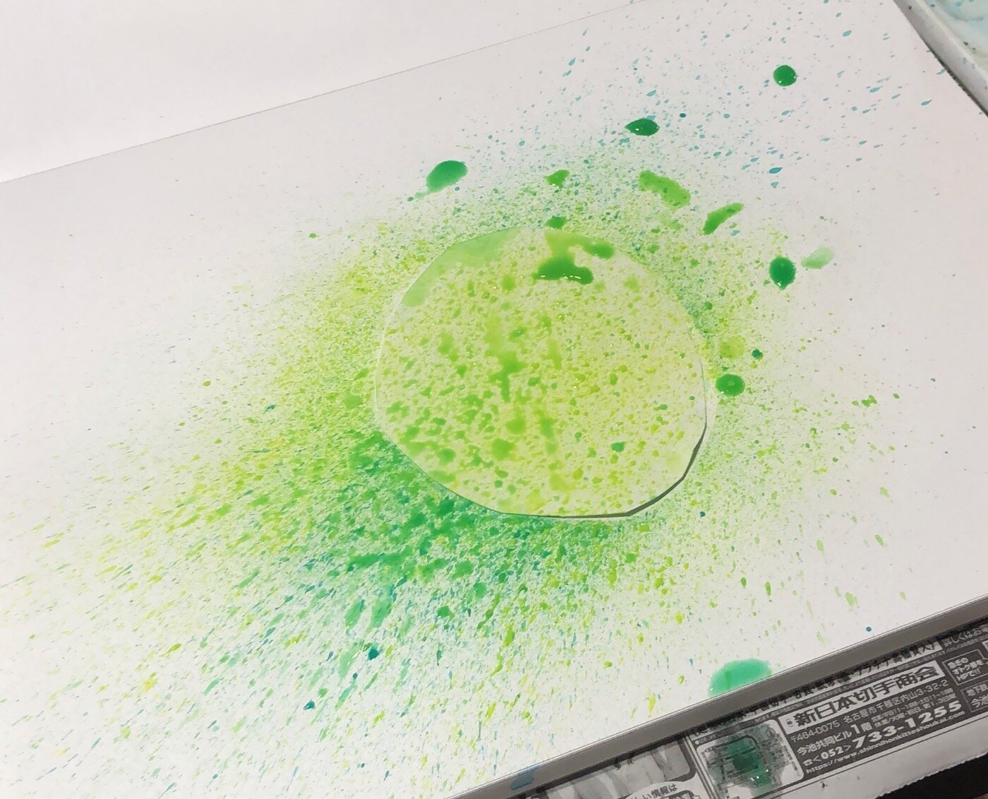 その上からスパッタリングをして、絵の具が乾いてから型紙を取りましょう。