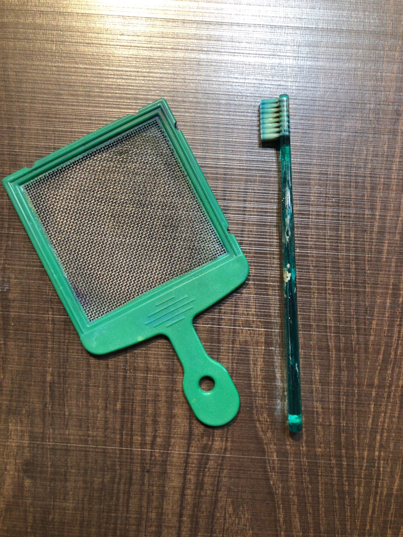 ①網を使ったバージョンでは、利き手に歯ブラシ、もう片方に網を持ちます。