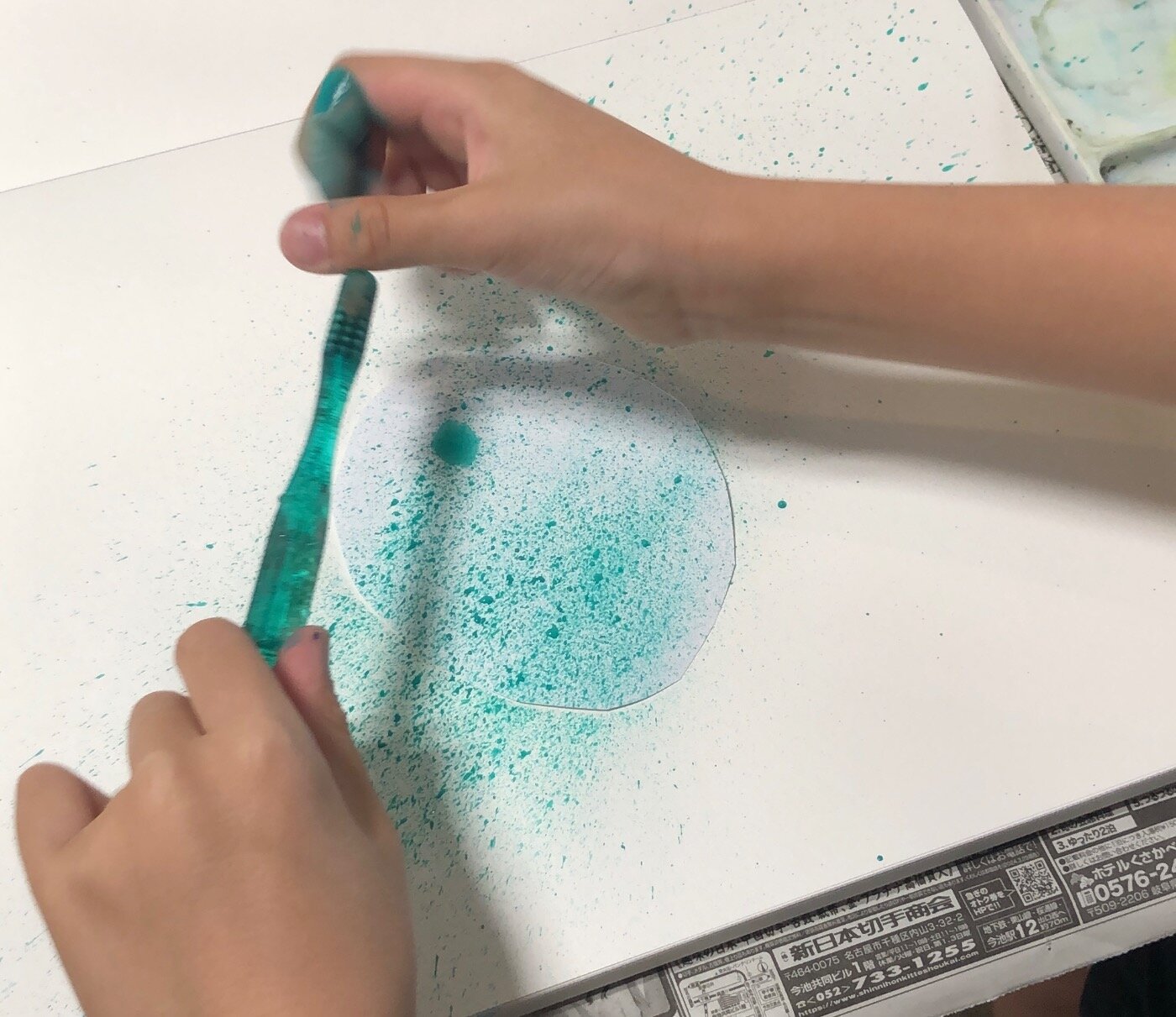 片手に絵の具をつけた歯ブラシを持って、もう片方の手の指で歯ブラシの毛を滑らせるようにしてはじいていくだけなので、手軽にできます。