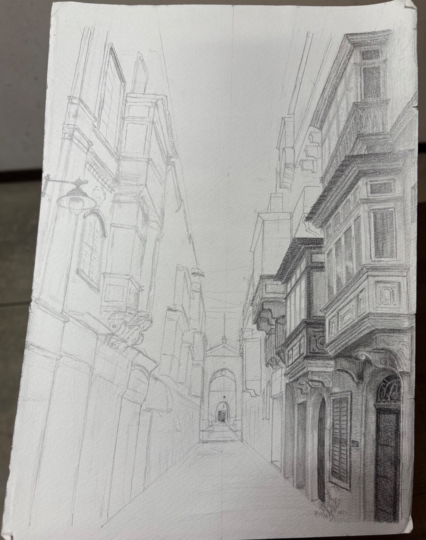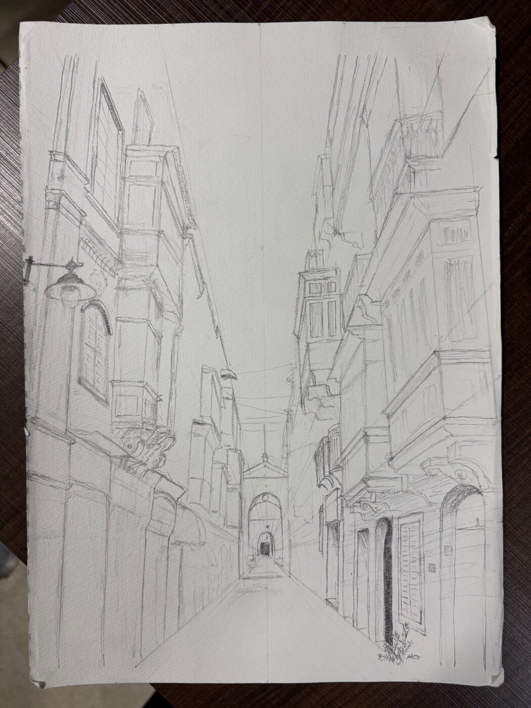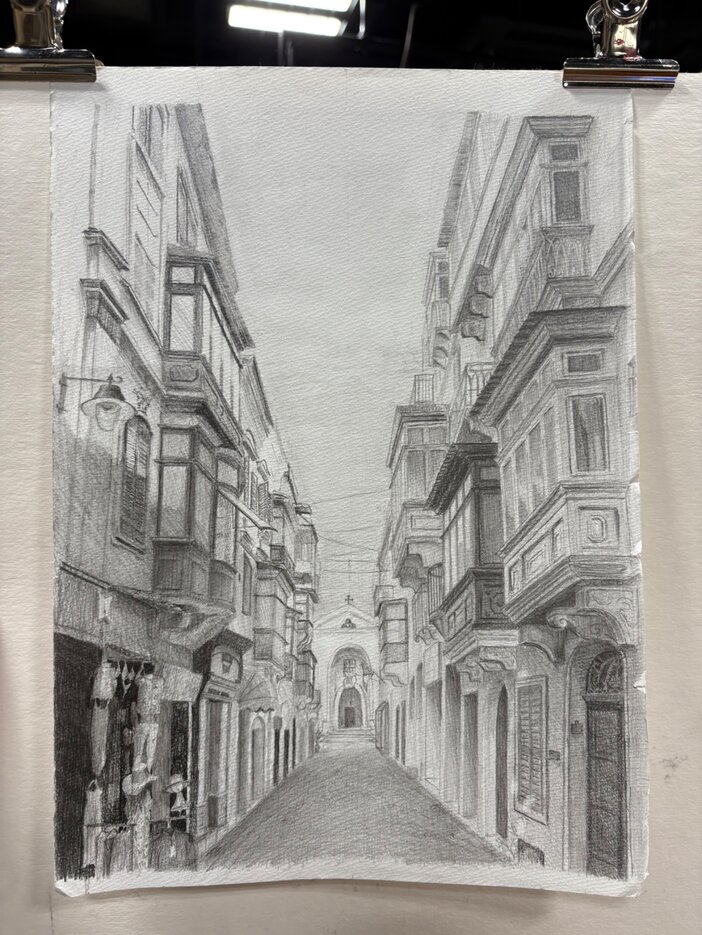 建物は、形を正確に描く事や明暗を考える事が難しいモチーフですが、コツコツと制作し、鉛筆表現に工夫をすることで、細密さと全体の大きな雰囲気の良さが両立した作品になったと思います。