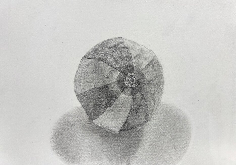 こちらの紙風船のようなカラフルなモチーフを白黒でデッサンすることは、ポイントが多く大変だったと思いますが、色の違いと紙風船の立体と光、観察をしっかりしていることが伝わってきます。