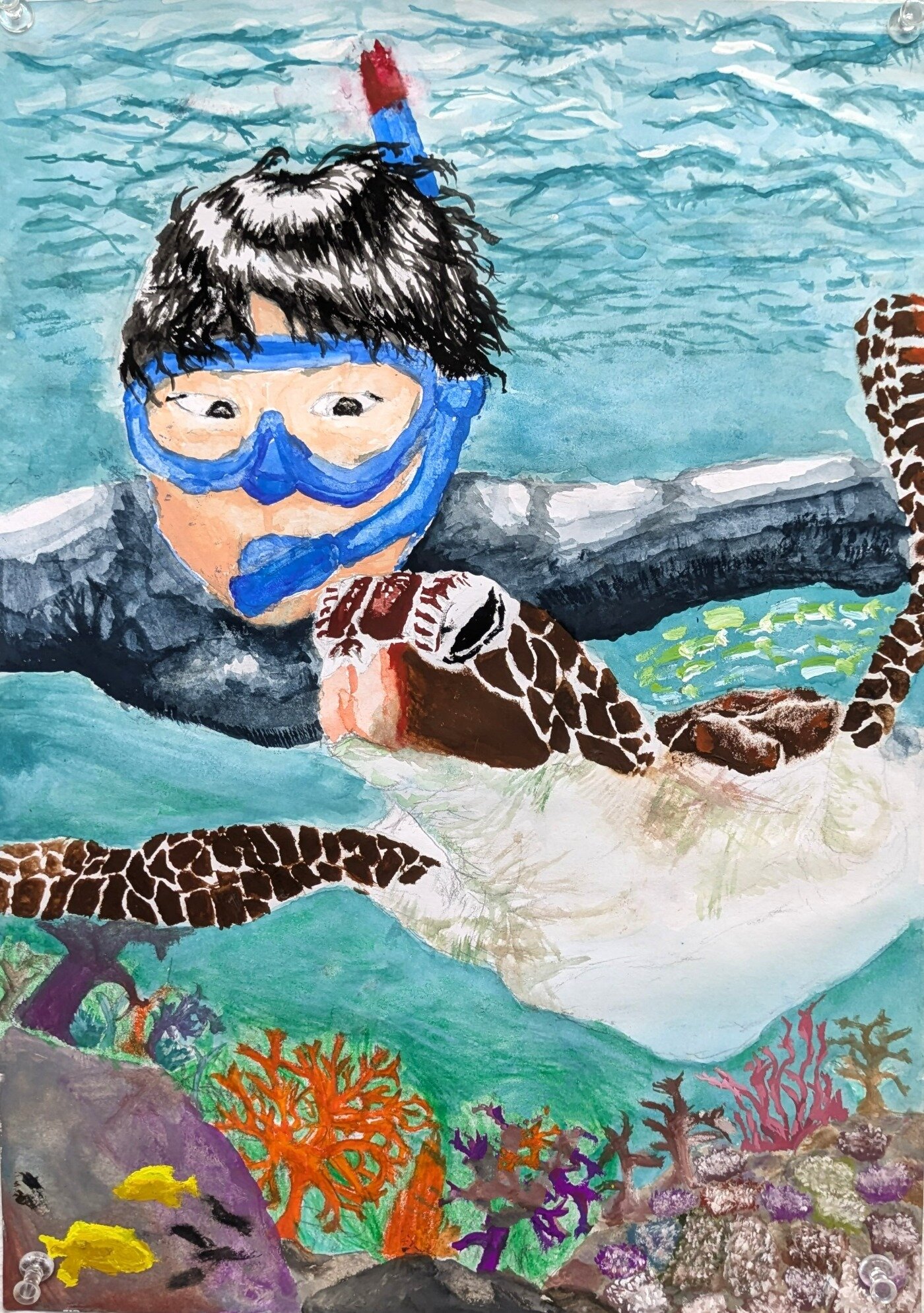 サンゴ礁の美しさが絶妙な中間色や陰色で表現される一方、主題となる自画像やウミガメは強い色使いで明快に描かれています。