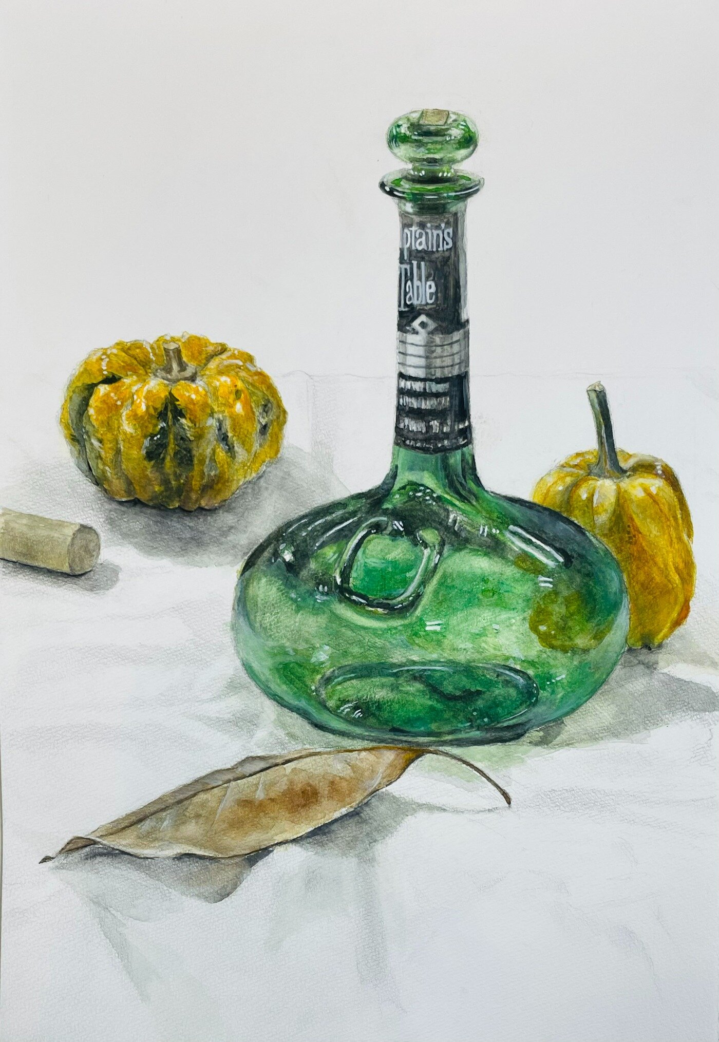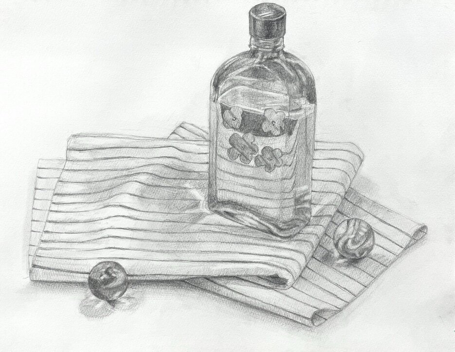 瓶やビー玉のキラキラ感と布の柔らかな様子がよく描けていますね。