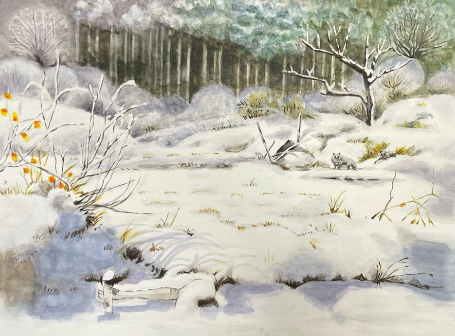 タヌキのたくさん登場する映画の背景画から選んで透明水彩で模写しました。