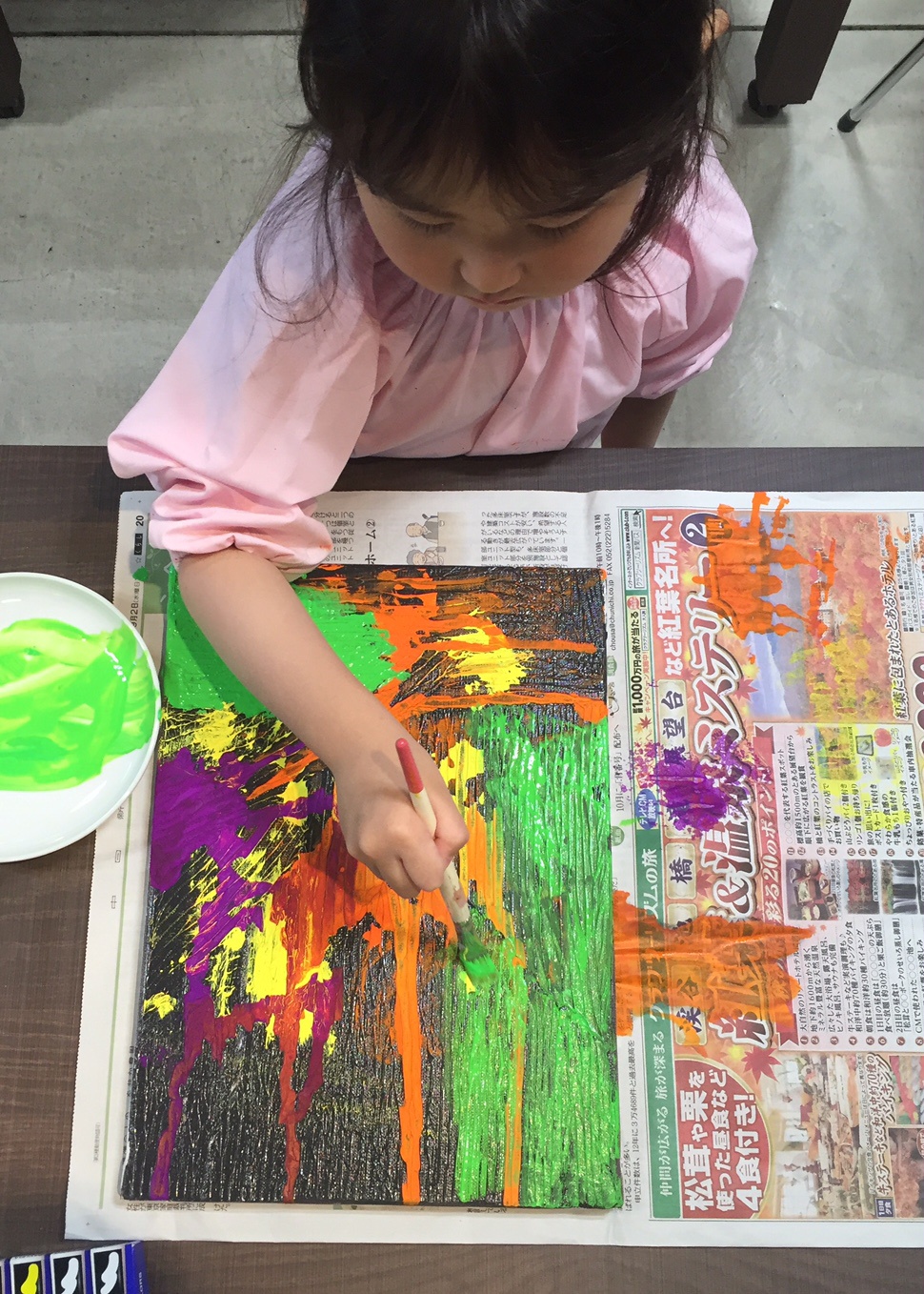 こちらはキャンバスに油絵の具で下地を作りました。そこに溶いたアクリルガッシュをたらし、傾けながら混じり合わせているところです。