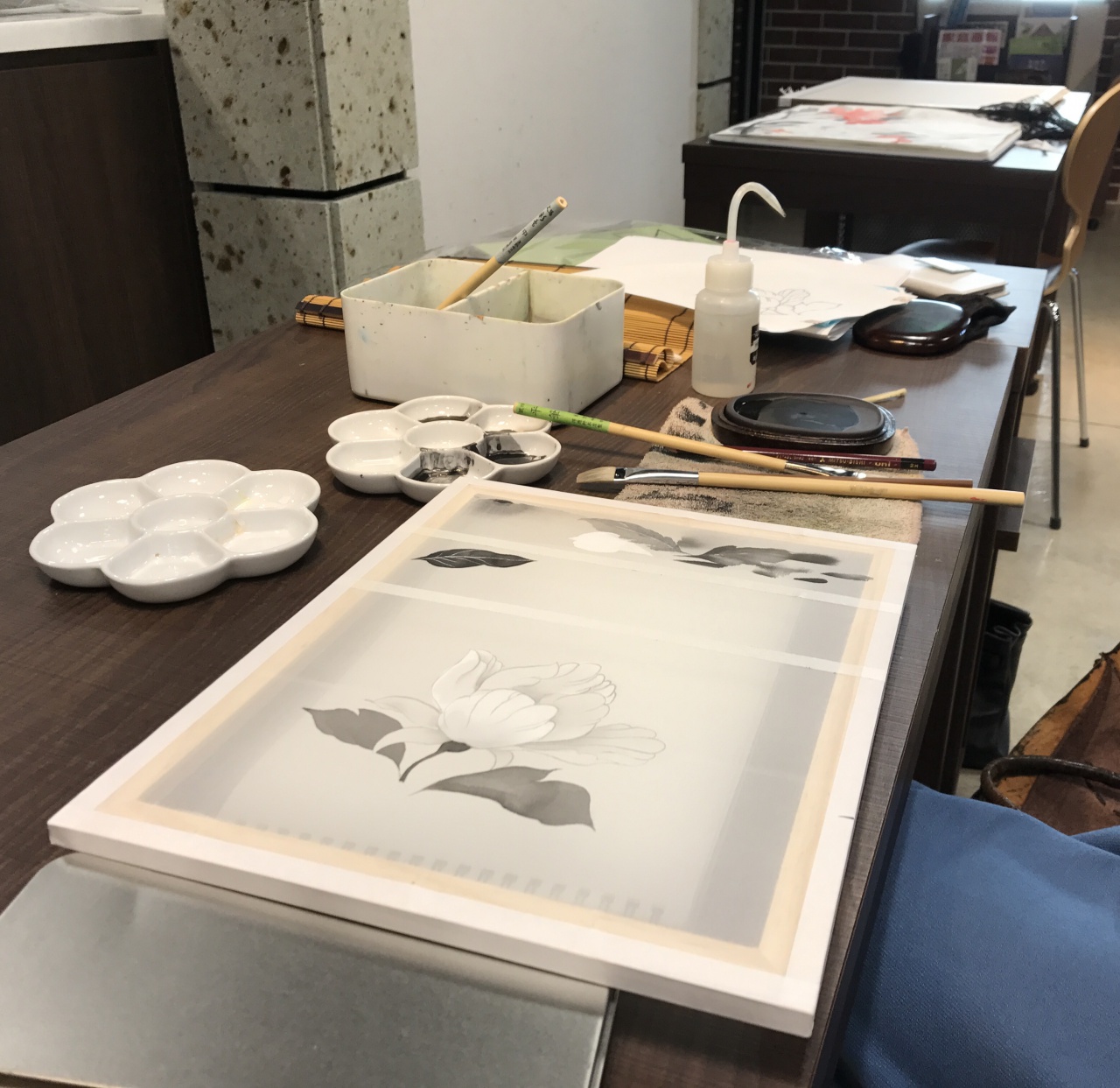 今日は試し用の絹で滲みや暈し、裏彩色と表彩色の違いなどを実験されていました。
