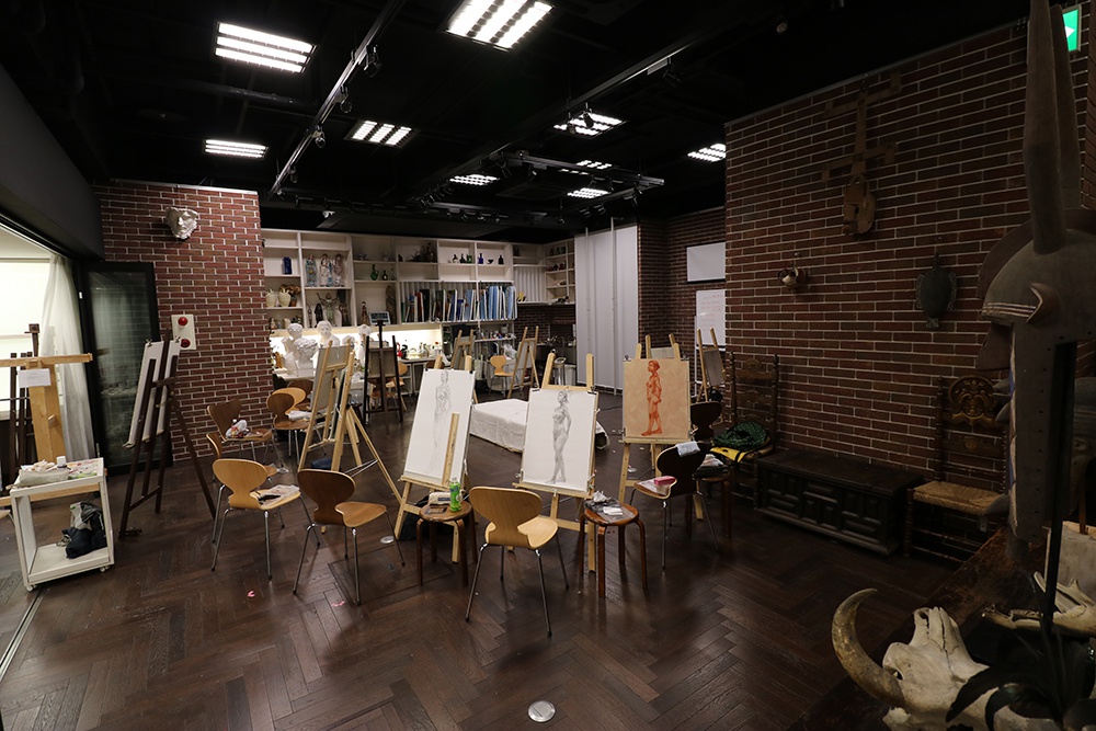現役作家の先生方の意見をもとに、空間の広さ、照明の明るさ、机の大きさ高さ、「あったらいいな」と思われる備品、モチーフなどを取りそろえ、絵を描く方のための理想的なアトリエ空間を用意いたしました。