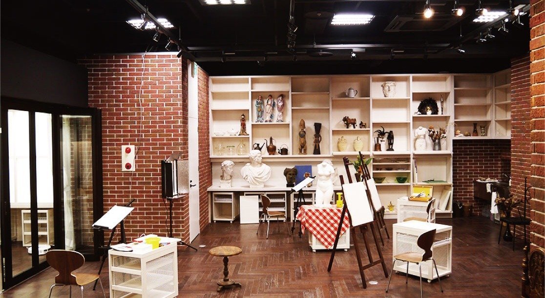 現役作家の先生方の意見をもとに、空間の広さ、照明の明るさ、「あったらいいな」と思われる備品、モチーフなどを取りそろえ、絵を描く方のための理想的なアトリエ空間を用意いたしました。
