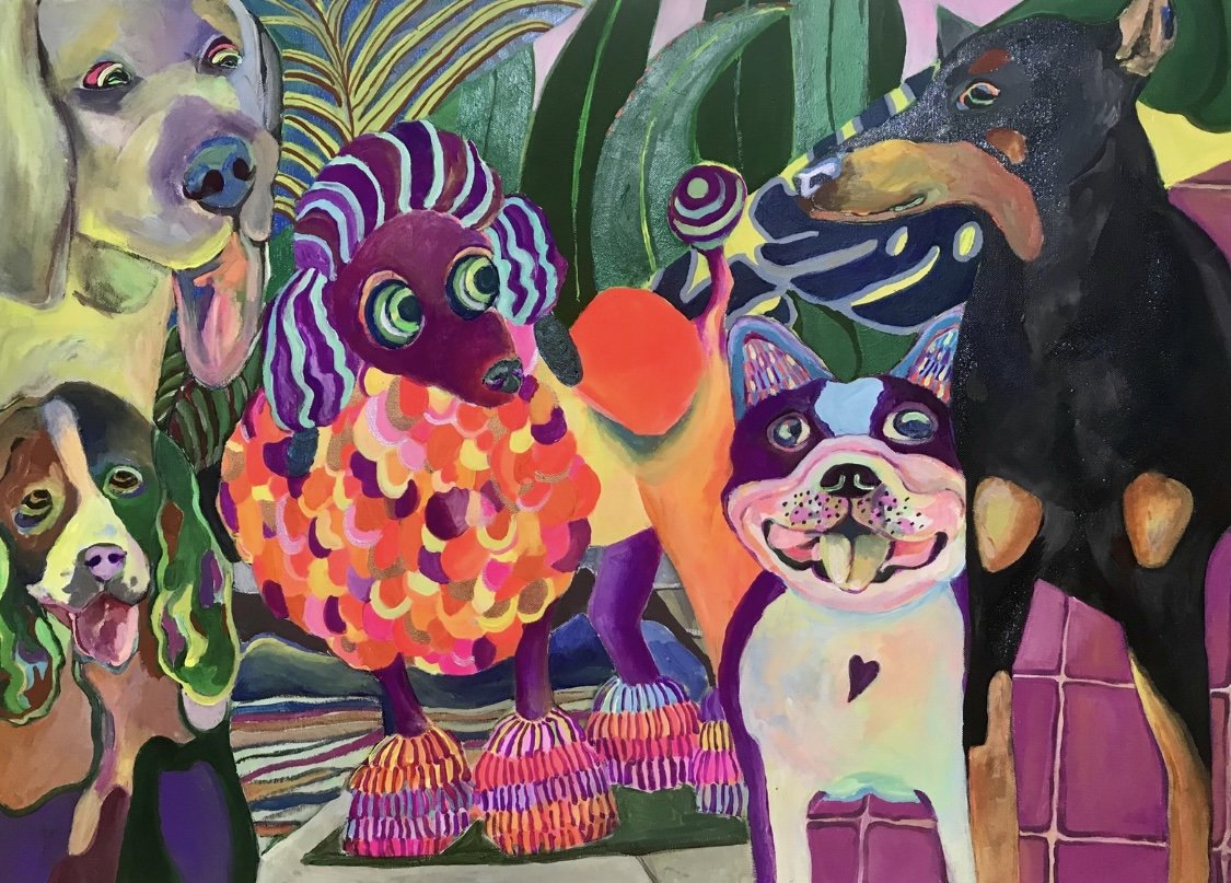 モチーフは、主に犬、動物、人物、植物といきものが多くとてもカラフルです。