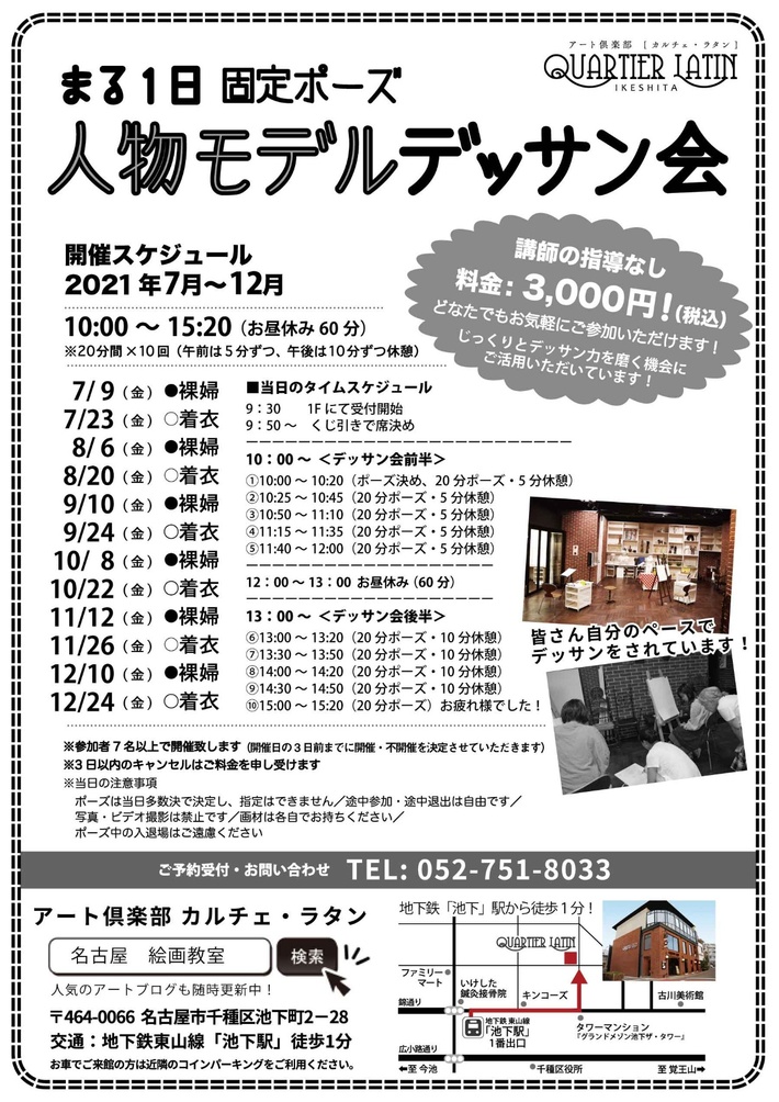 '21 9/10 Fri まる一日固定ポーズの人物モデルデッサン会(裸婦) 10:00 ~ 15:20 |B1Fにて開催します まる1日固定ポーズの人物モデルデッサン会を以下のスケジュールで開催いたします。 絵画教室の会員様はもちろん、一般の方もお気軽に参加いただけるデッサン会です。 毎月第2金曜日は裸婦モデルデッサン、第4金曜日は着衣モデルデッサンですが、 2021年の8月はお盆の兼ね合いで、第1金曜日に裸婦モデルデッサン、第3金曜日に着衣モデルデッサンとなっていますのでご注意ください。 税込3,000円で、一つの固定ポーズをじっくりと10ポーズ分(1ポーズ20分)描けるデッサン企画です。 是非デッサンの練習の場としてご活用ください。 上記イベントに参加をご希望される方は、以下のメールフォームからお申し込みください。 お名前必須 フリガナ 人数必須 1人 2人 3人 4人 5人 6人 7人 8人 9人 メールアドレス必須 電話番号必須