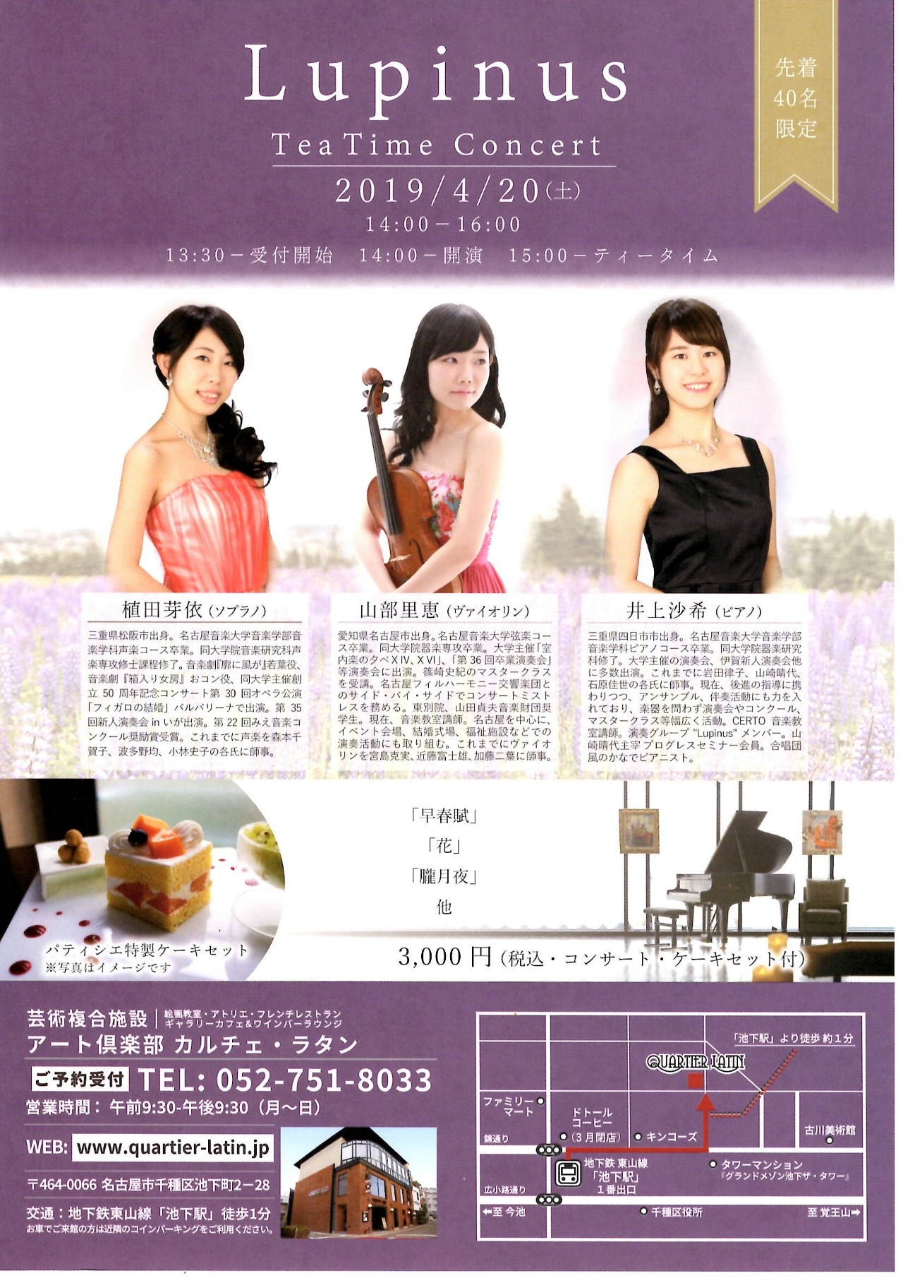 '19 4/20 Sat Lupinus Tea Time Concert 14:00 ~ 16:00 |3Fにて開催します 上記イベントに参加をご希望される方は、以下のメールフォームからお申し込みください。 お名前必須 フリガナ 人数必須 1人 2人 3人 4人 5人 6人 7人 8人 9人 メールアドレス必須 電話番号必須