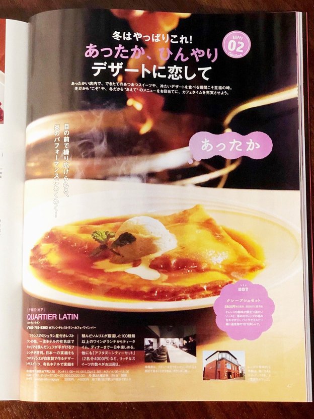 月刊ケリー1月号に、冬にこそ食べたい あったかデザートとして、カルチェ・ラタンのクレープシュゼットを大きく1ページで取材掲載いただきました!