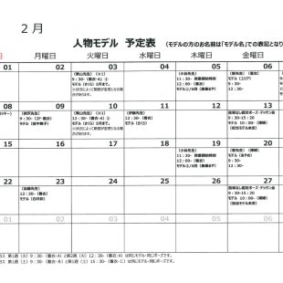 2026年2月の人物モデル教室、指導なしデッサン会スケジュールを掲示します。 教室出席のご参考になさってください。 ※モデルのお名前は「モデル名」での表記となります。