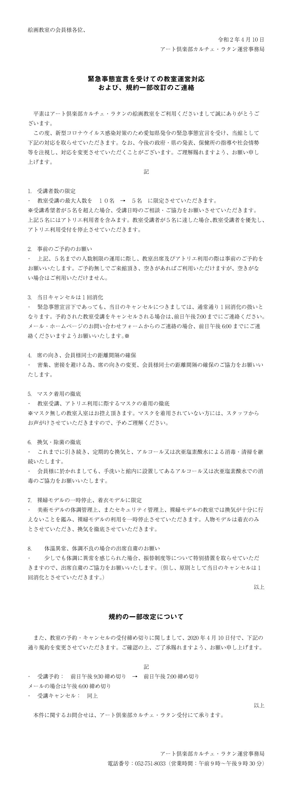 平素はアート倶楽部カルチェ・ラタンの絵画教室をご利用くださいまして誠にありがとうございます。