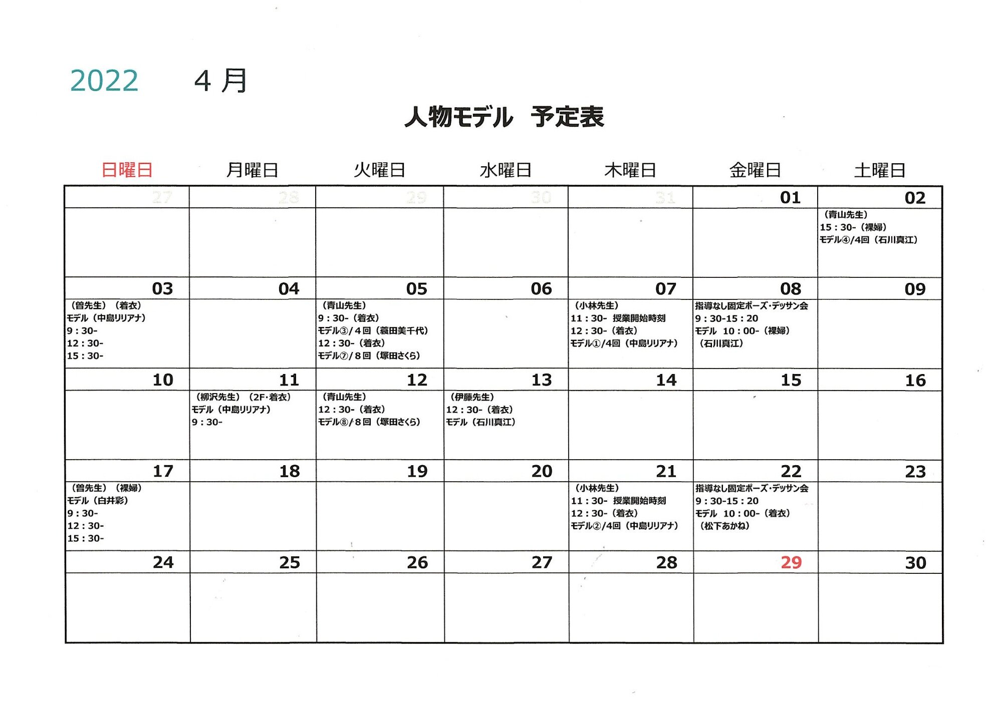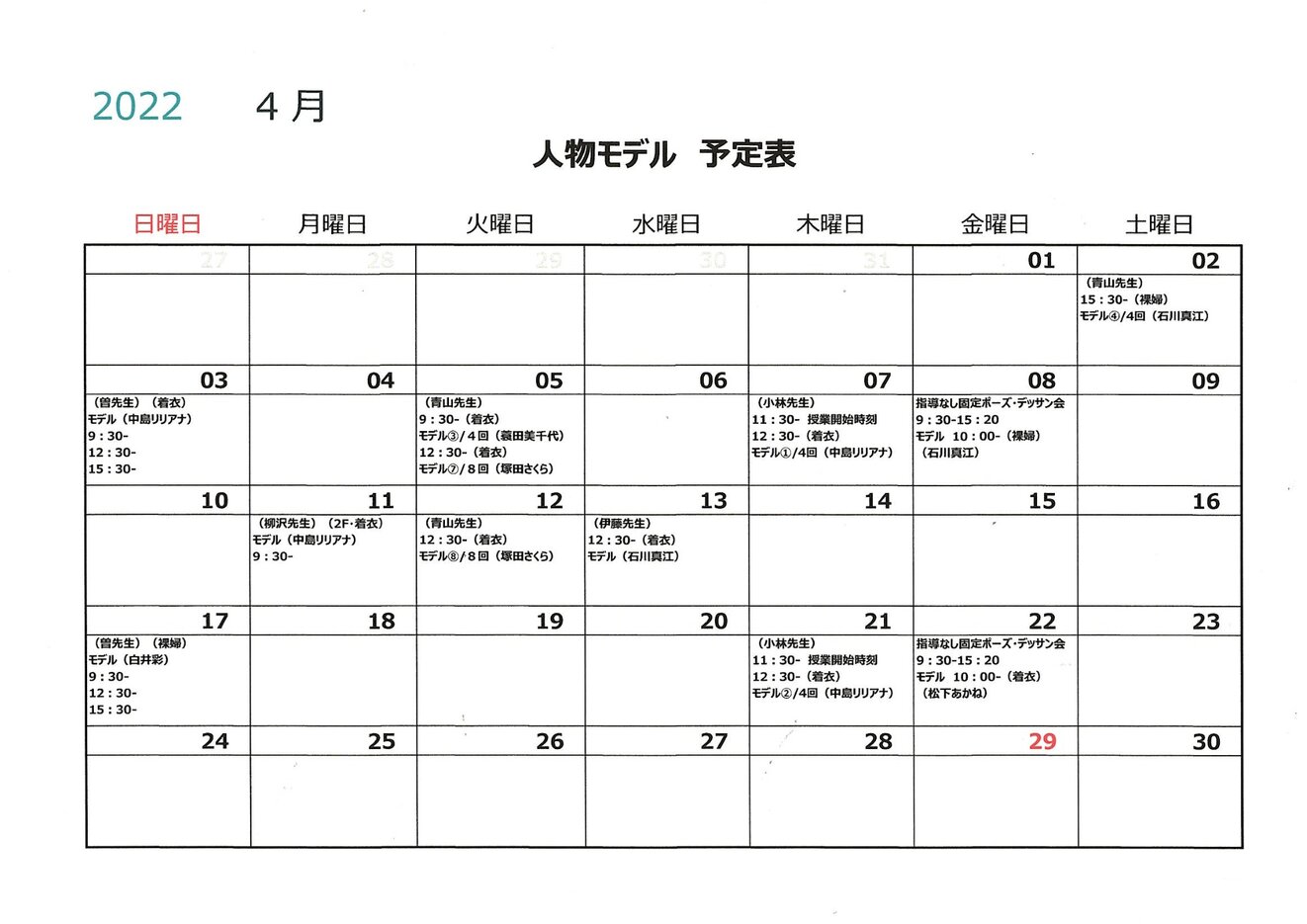令和4年4月の人物モデル教室・人物デッサン会情報 2022/03/22 | 絵画教室 | #人物デッサン #裸婦モデル #デッサン会 2022年4月の人物モデル教室、指導なしデッサン会のスケジュールを掲示します。 教室出席のご参考にされてください。