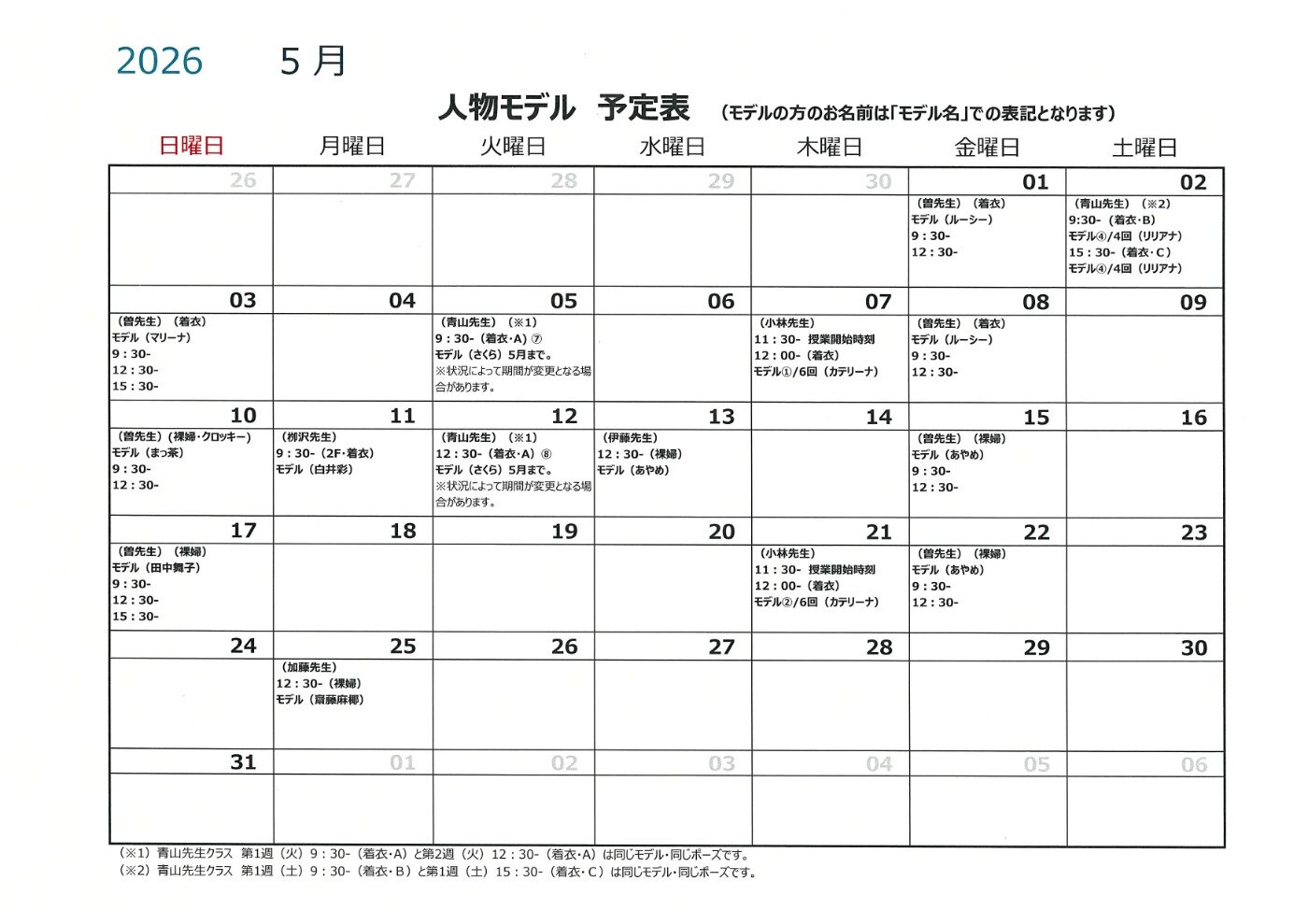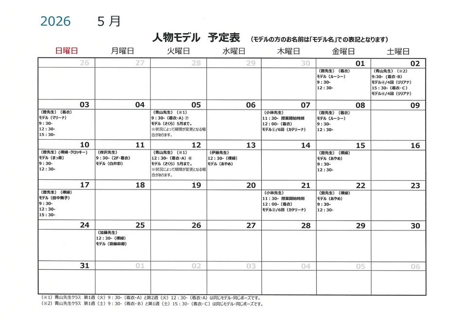 令和8年5月人物モデル教室情報 2026/04/06 | 絵画教室 | #人物デッサン #裸婦モデル #着衣モデル #デッサン会 #デッサン 2026年5月の人物モデル教室スケジュールを掲示します。 教室出席のご参考になさってください。 ※モデルのお名前は、「モデル名」での表記となります。
