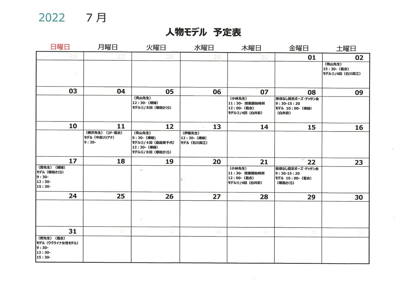 【修正版】令和4年7月の人物モデル教室・人物デッサン会情報 2022/06/24 | #人物デッサン #裸婦モデル #デッサン会 2022年7月の人物モデル教室予定表の変更がございます。 修正版を掲示致しますので、ご確認のほど、よろしくお願い申し上げます。 【変更箇所】 7/5(火)9:30-(裸婦)モデル②/4回(蓑田美千代)➡休講のため削除 7/12(火)9:30-記入なし➡9:30-(裸婦)モデル②/4回(蓑田美千代)と追記 以上、お手数をお掛け致しますが何卒宜しくお願い申し上げます。