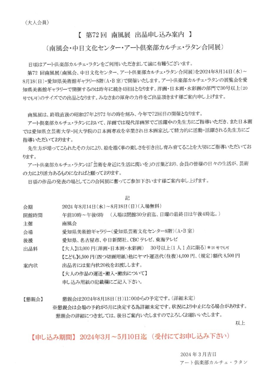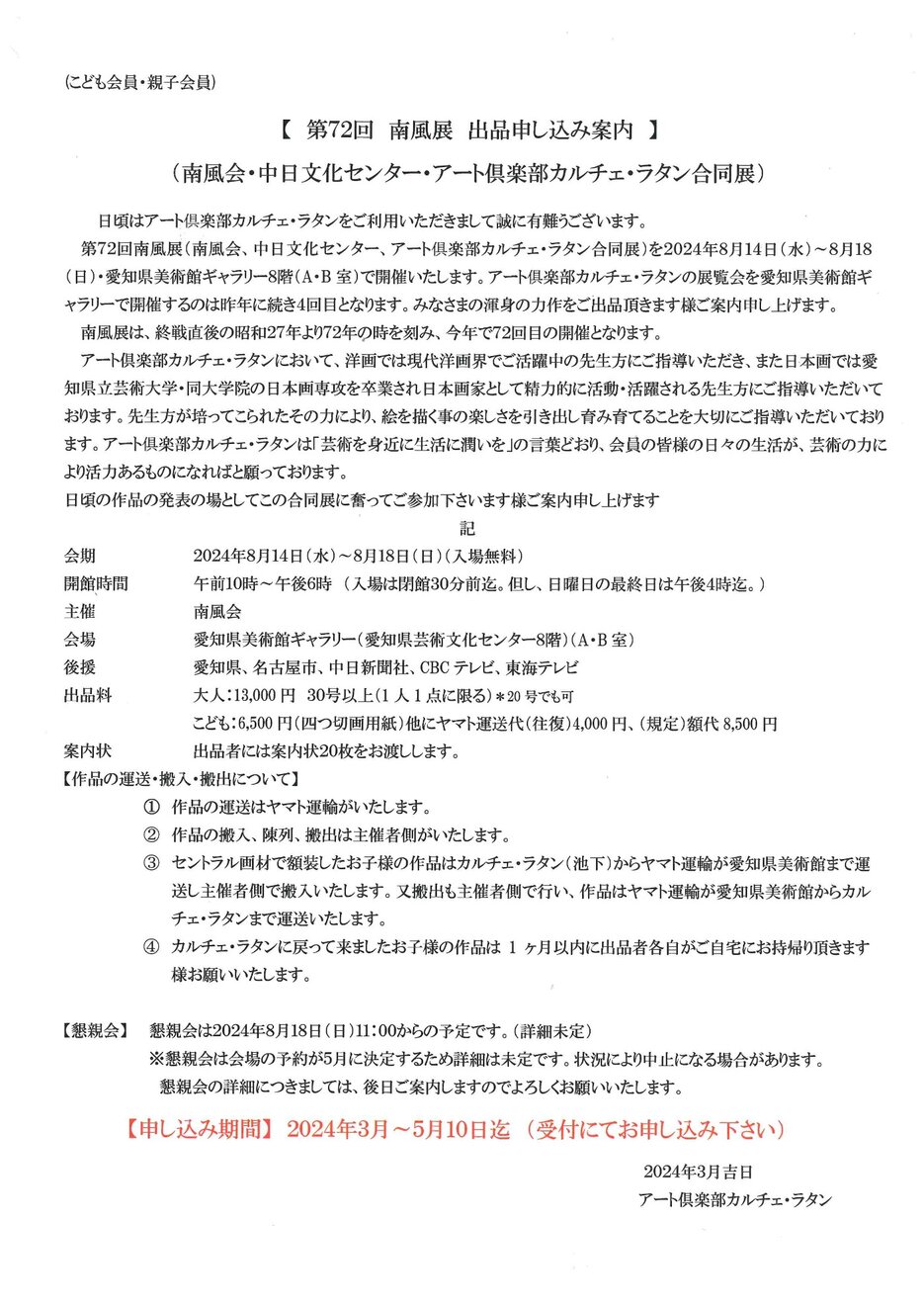 第72回南風展(南風会・中日文化センター・アート倶楽部カルチェ・ラタン合同展)につきまして、