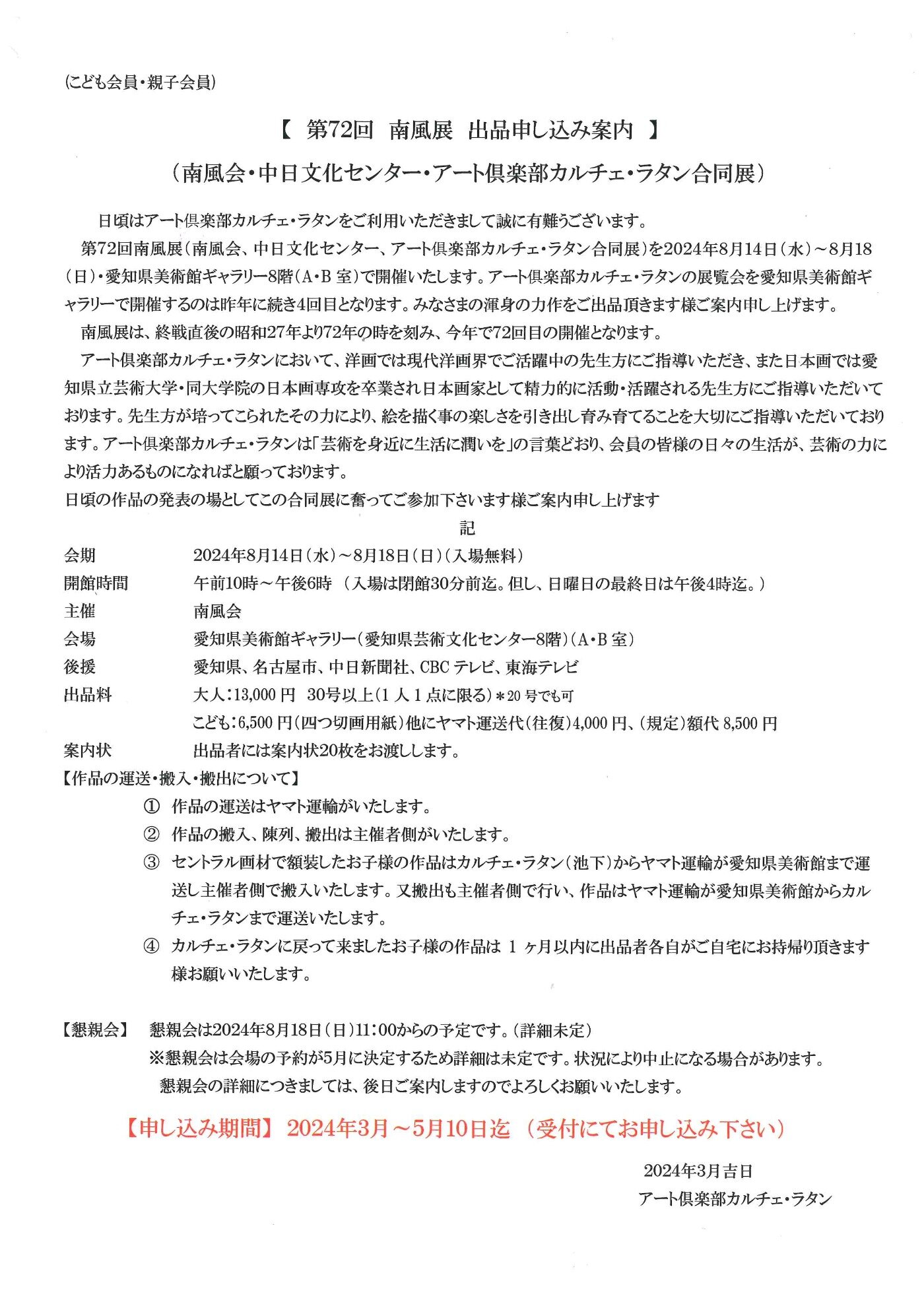 アート倶楽部カルチェ・ラタンの作品展(南風展)の申込についてのご案内です。