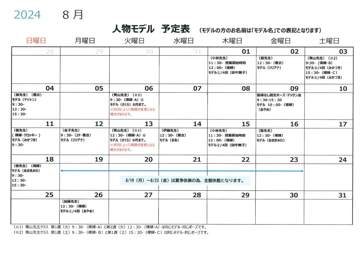 令和6年8月人物モデル教室・人物デッサン会情報 2024/07/09 | #人物デッサン #裸婦モデル #デッサン会 2024年8月の人物モデル教室、指導なしデッサン会スケジュールを掲示します。 教室出席のご参考になさってください。 ※モデルの方のお名前は「モデル名」での表記となります。 ★2024年8月19日(月)~23日(金)は夏季休業での全館休館となります。ご注意ください。