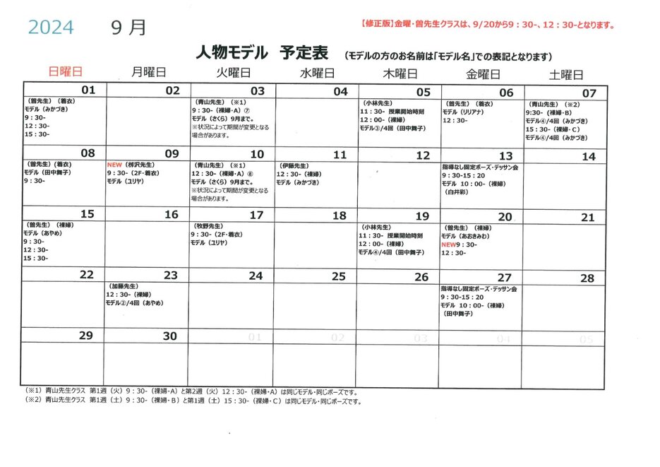 2024年9月の人物モデル教室、指導なしデッサン会スケジュールを掲示します。