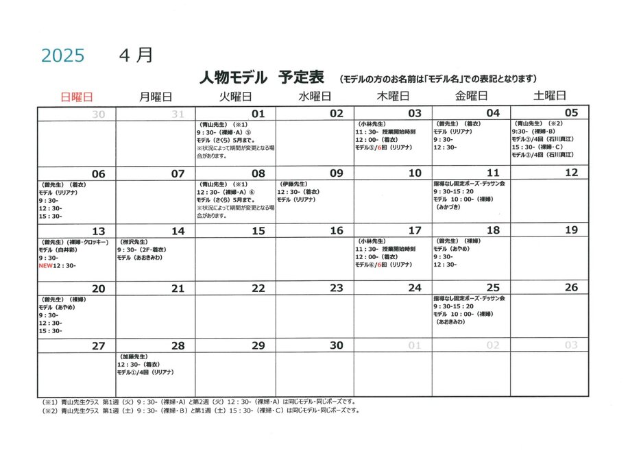令和7年4月人物モデル教室・人物デッサン会情報 2025/03/12 | #人物デッサン #裸婦モデル #着衣モデル #デッサン会 2025年4月の人物モデル教室、指導なしデッサン会のスケジュールを掲示します。 教室出席のご参考になさってください。 ★2025年4月から、第2週(日)12:30-(曽先生)の教室が人物モデル教室に変更となります。 ※モデルの方のお名前は「モデル名」での表記となります。