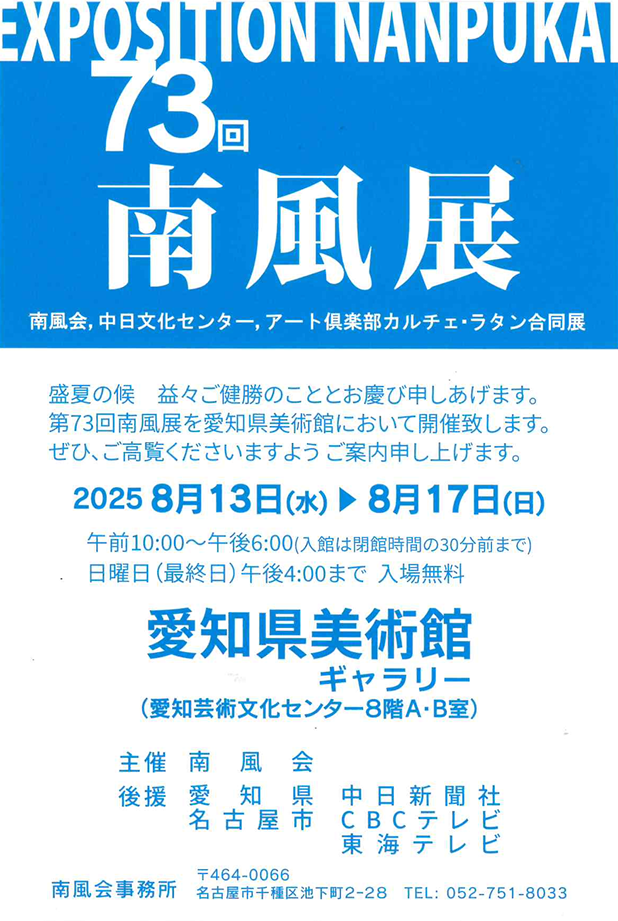 この度、第73回南風展 ー中日文化センター、カルチェラタン合同展ー を愛知県美術館ギャラリーにて開催いたします。