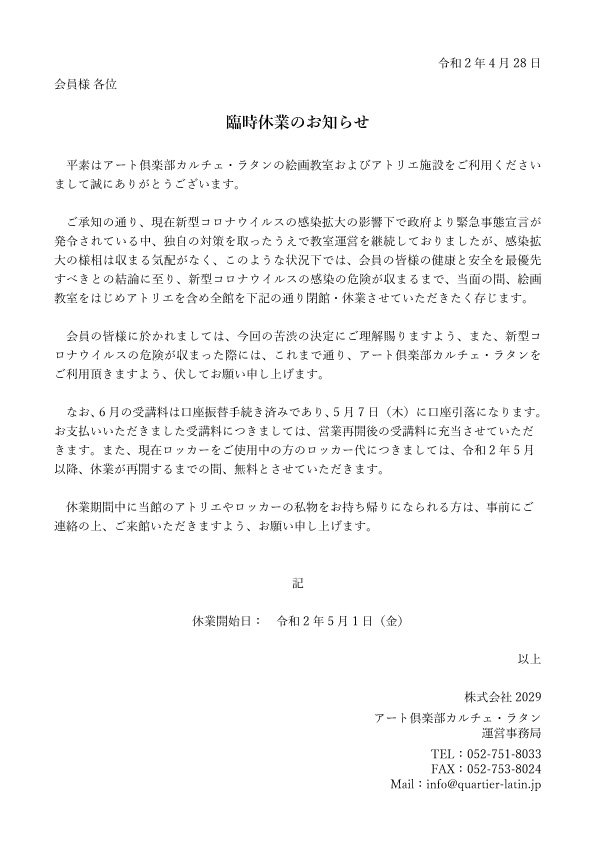 会員の皆様に於かれましては、今回の苦渋の決定にご理解賜りますよう、また、新型コロナウイルスの危険が収まった際には、これまで通り、アート倶楽部カルチェ・ラタンをご利用頂きますよう、伏してお願い申し上げます。
