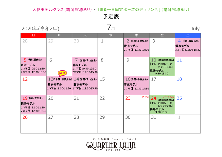 2020年7月の「人物モデル教室」&「指導なしデッサン会」の日程