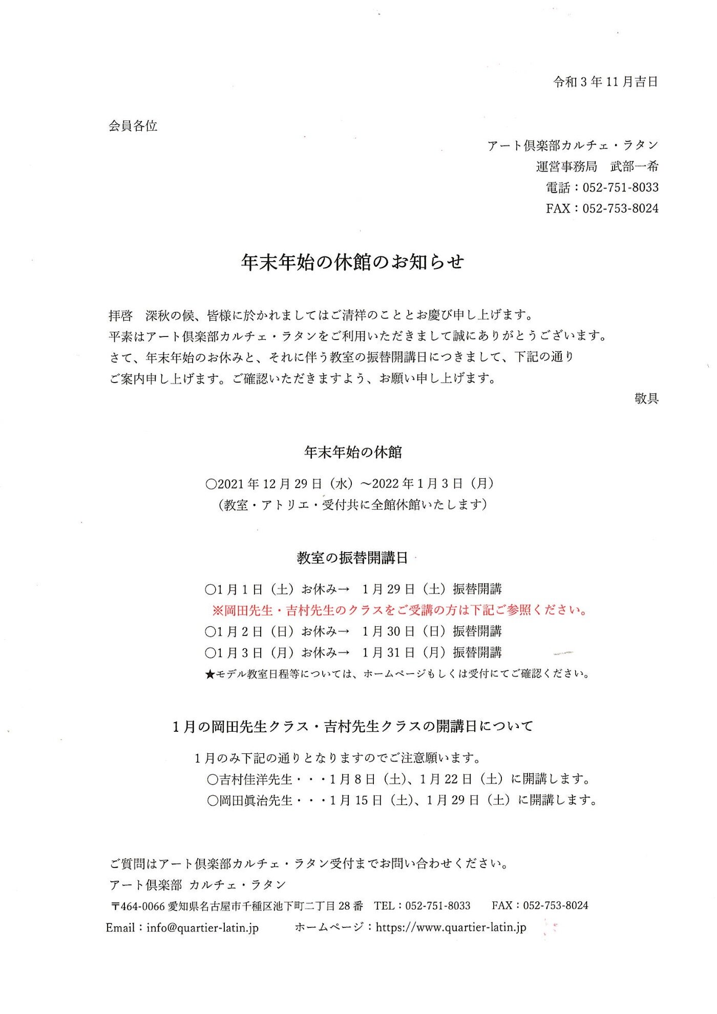 1月の岡田先生クラス・吉村先生クラスの開講日について