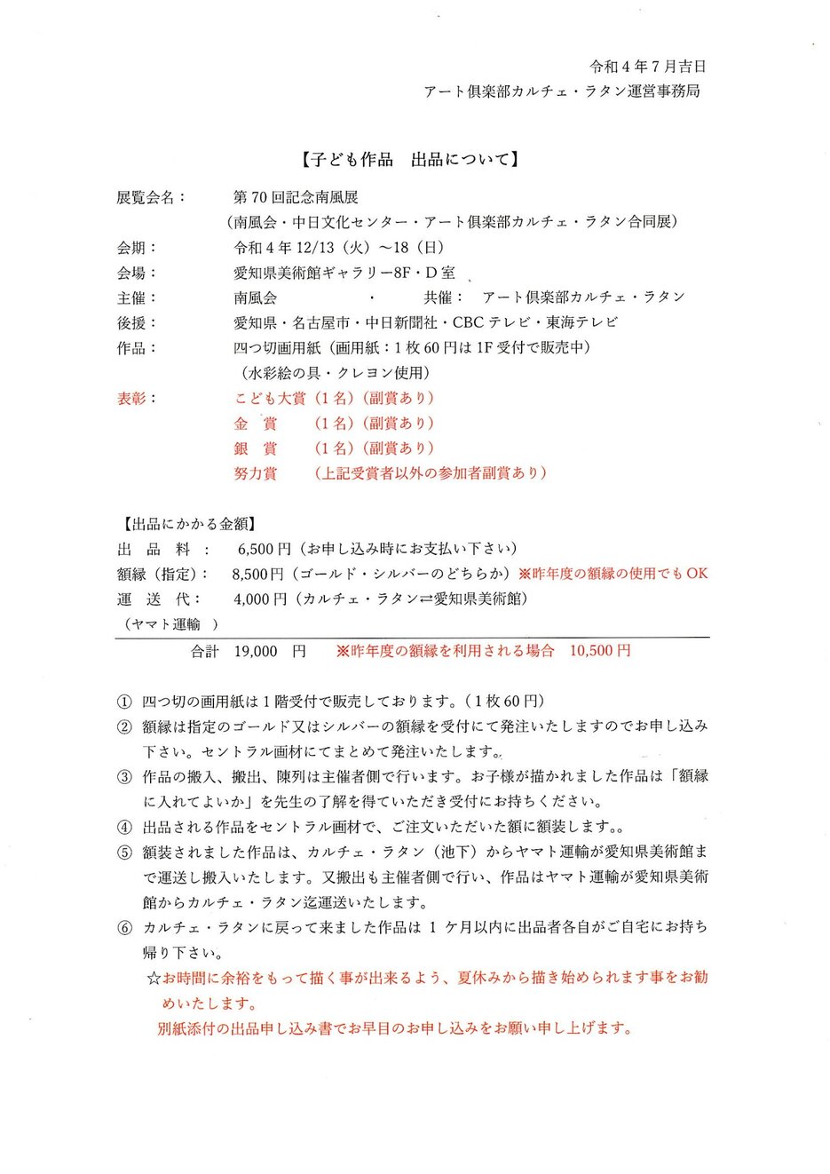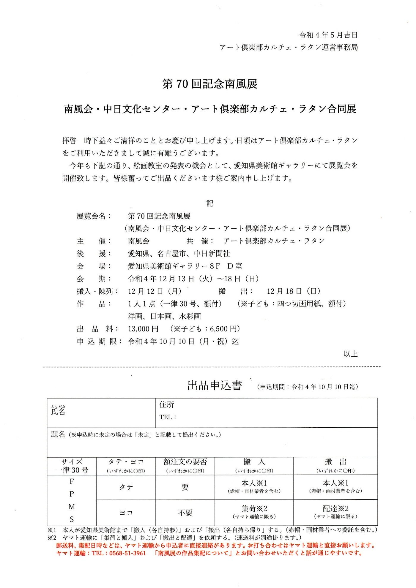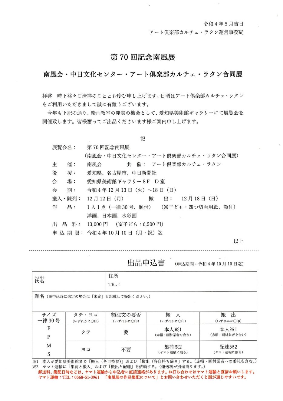 南風会・中日文化センター・アート倶楽部カルチェ・ラタン合同展の出品についてのご案内です。