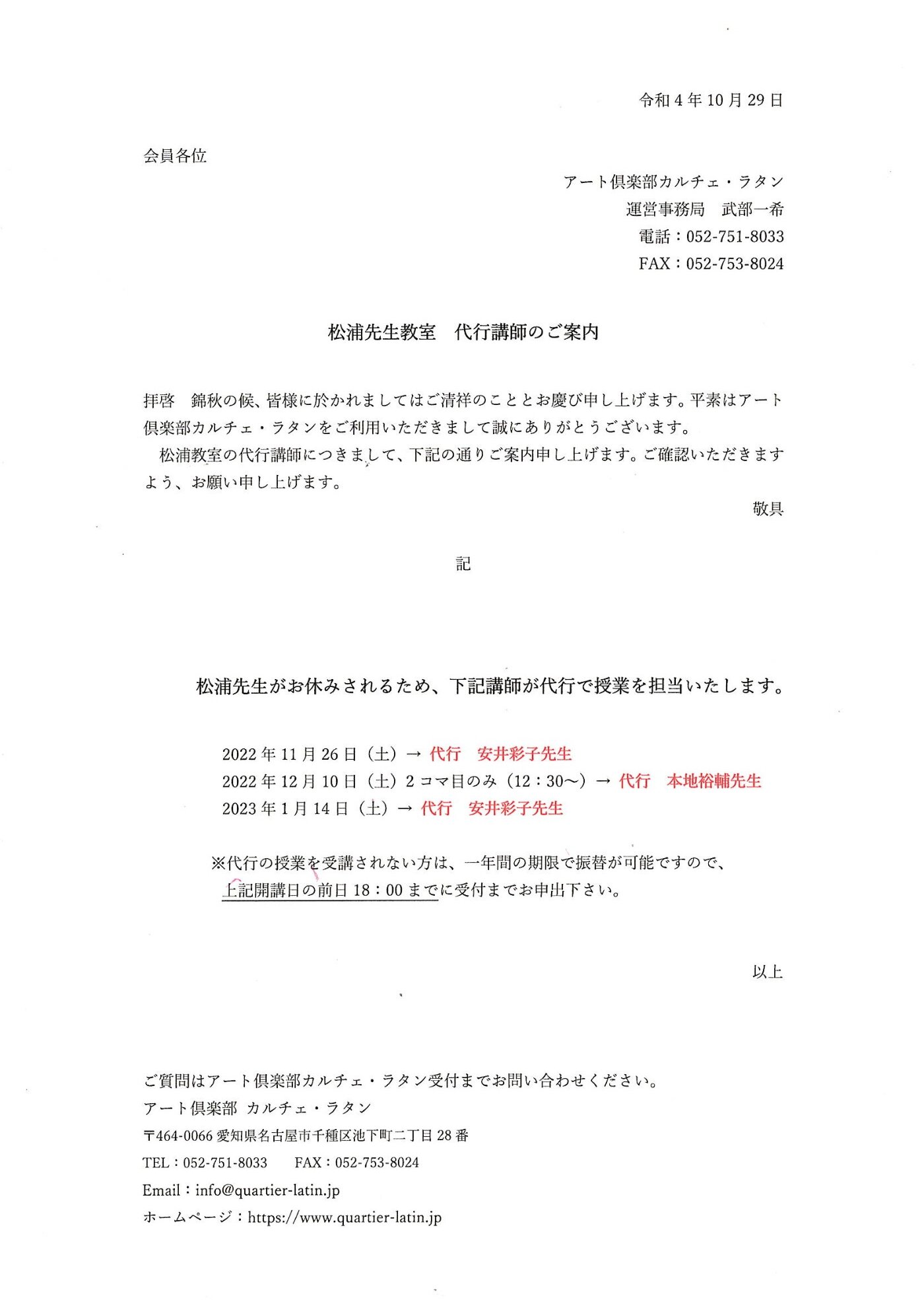 松浦先生がお休みされるため、下記講師が代行で授業を担当いたします。