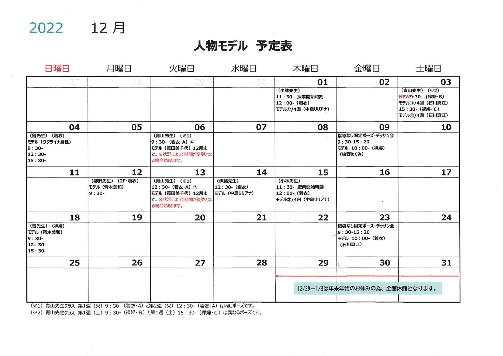 令和4年12月の人物モデル教室・人物デッサン会情報 2022/11/15 | 会員様へのご案内 | #人物デッサン #裸婦モデル #デッサン会 2022年12月の人物モデル教室、指導なしデッサン会のスケジュールを掲示します。教室出席の参考にされてください。