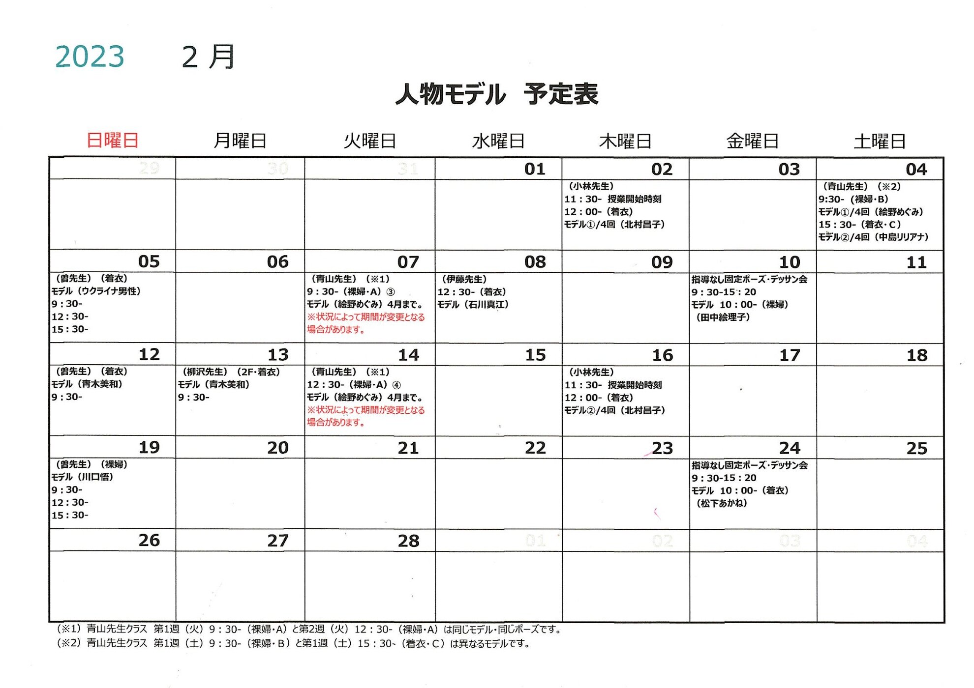 令和5年2月の人物モデル教室・人物デッサン会情報 2023/01/20 | 会員様へのご案内 | #人物デッサン #裸婦モデル #デッサン会 2023年2月の人物モデル教室、指導なしデッサン会スケジュールを掲示します。 教室出席の参考にされてください。