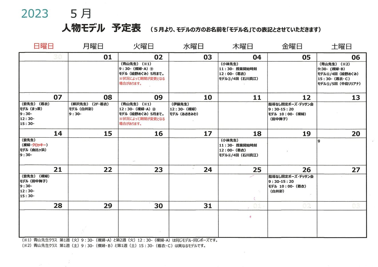 令和5年5月人物モデル教室・人物デッサン会情報 2023/04/11 | 会員様へのご案内 | #人物デッサン #裸婦モデル #デッサン会 2023年5月の人物モデル教室、指導なしデッサン会スケジュールを掲示します。 教室出席の参考にされてください。 ※5月より、モデルの方のお名前を「モデル名」での表記とさせていただきます。ご承知おきくださいますようお願い申し上げます。