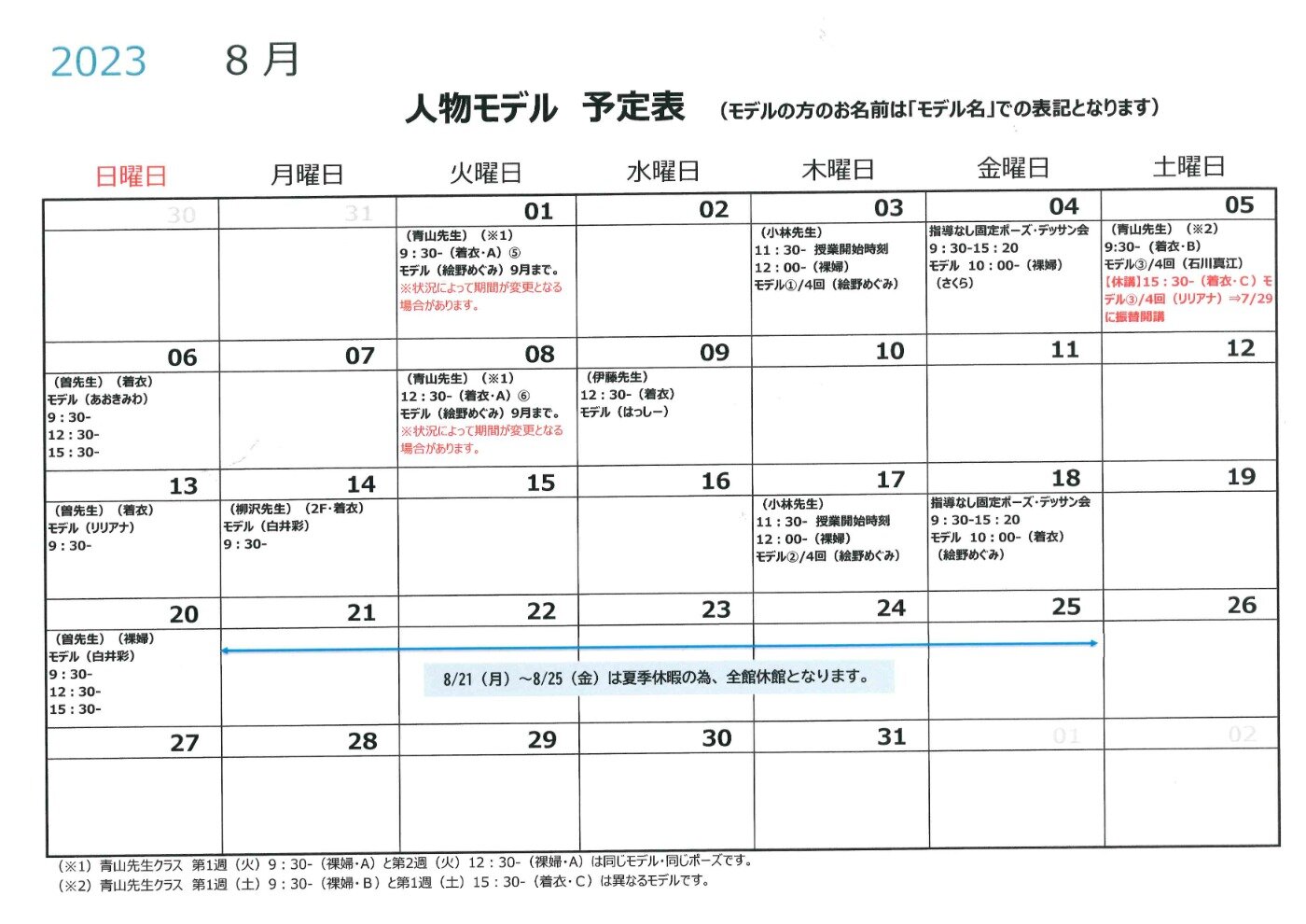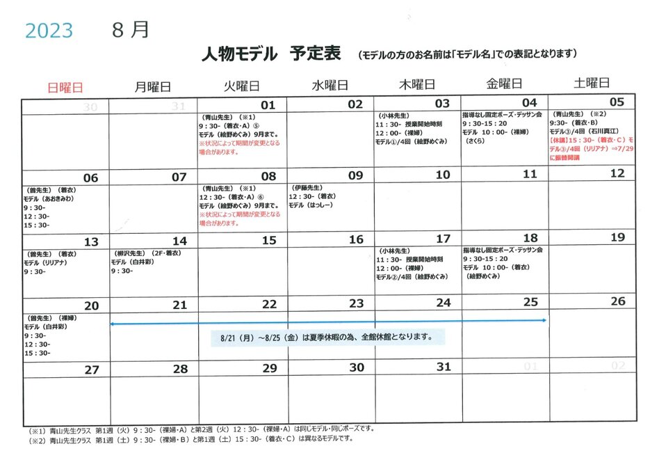 令和5年8月人物モデル教室・人物デッサン会情報 2023/07/10 | 会員様へのご案内 | #人物デッサン #裸婦モデル #デッサン会 2023年8月の人物モデル教室、指導なしデッサン会スケジュールを掲示します。 教室出席の参考にされてください。 ※モデルの方のお名前は「モデル名」での表記となります。