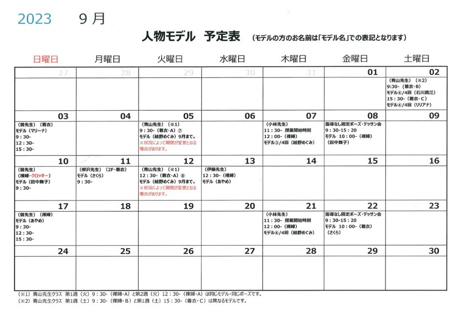 令和5年9月人物モデル教室・人物デッサン会情報 2023/08/14 | 会員様へのご案内 | #人物デッサン #裸婦モデル #デッサン会 2023年9月の人物モデル教室、指導なしデッサン会スケジュールを掲示します。 教室出席の参考にされてください。 ※モデルの方のお名前は「モデル名」で表記となります。