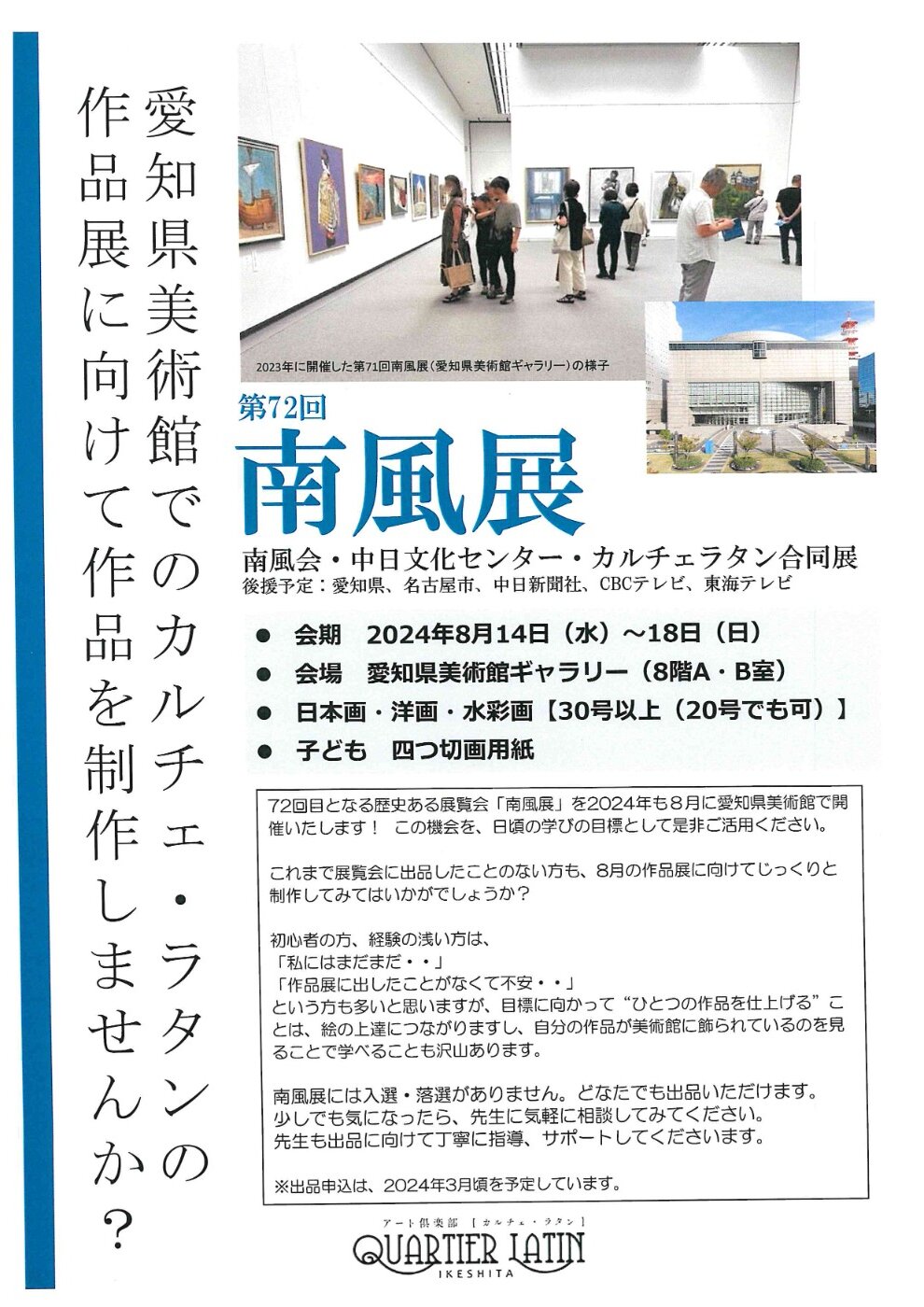 第72回南風展を、2024年8月14日(水)~18(日)に愛知県美術館にて開催いたします。
