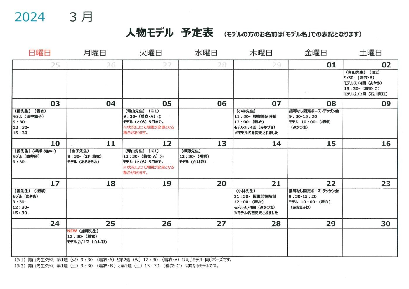 令和6年3月人物モデル教室・人物デッサン会情報 2024/02/16 | 会員様へのご案内 | #人物デッサン #裸婦モデル #着衣モデル #デッサン会 2024年3月の人物モデル教室、指導なしデッサン会スケジュールを掲示します。 教室出席のご参考になさってください。 ※モデルの方のお名前は「モデル名」での表記となります。