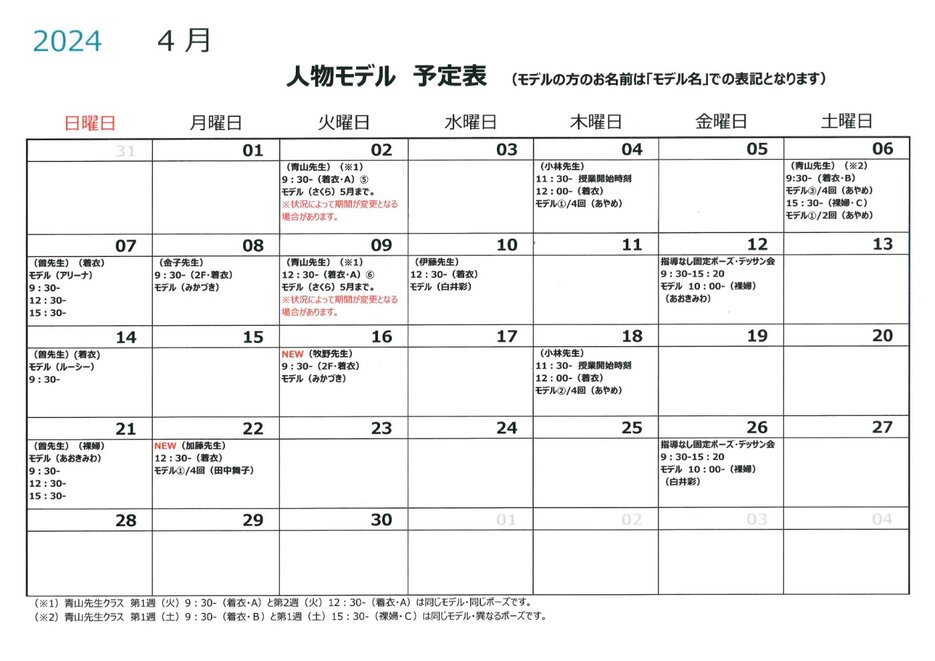 【修正版】令和6年4月人物モデル教室・人物デッサン会情報 2024/04/05 | 会員様へのご案内 | #人物デッサン #裸婦モデル #着衣モデル #デッサン会 【2024/4/5修正版】2024年4月の人物モデル教室、指導なしデッサン会スケジュールを掲示します。 ★2024年4月から、第3週火曜日9:30-から日本画・牧野環先生クラスで人物モデル教室が開講されます。 スケジュールに追加しましたので、ご確認をお願いいたします。 ★4/7(日)の着衣モデルがあやめさん⇒アリーナさんに変更となりました。 ★4/26(金)指導なしデッサン会は、着衣(白井彩)⇒裸婦(白井彩)に変更となりました。 ※上記以外のモデルクラスにつきましては当初掲示していた内容と変更はありません。 ※モデルの方のお名前は「モデル名」での表記となります。