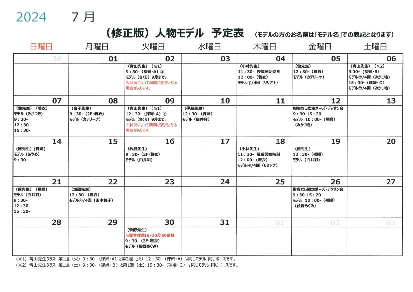 【修正版】令和6年7月人物モデル教室・人物デッサン会情報 2024/06/21 | 会員様へのご案内 | #人物デッサン #裸婦モデル #着衣モデル #デッサン会 【2024/06/21修正版を掲示します】 7月人物モデル予定表につきまして、修正がございます。 ■修正箇所 ★7/5(金)は裸婦(カテリーナ)⇒着衣(カテリーナ)に修正しました。 ★7/19(金)は着衣(白井彩)⇒裸婦(白井彩)に修正しました。 ご迷惑をお掛け致しますが、何卒宜しくお願い申し上げます。