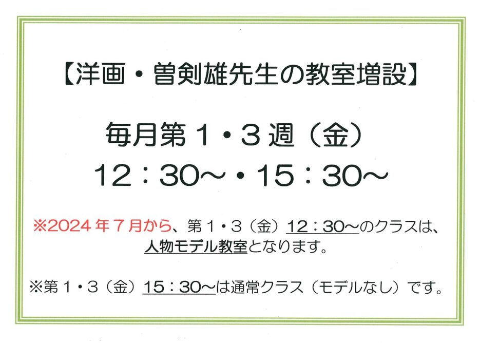 洋画・曽剣雄先生の教室が増設されました! 2024/06/11 | 会員様へのご案内 | #洋画 #人物画教室 #人物デッサン #曽剣雄 洋画・曽剣雄先生の教室が増設されました。 毎月第1・3週(金) 12:30~と15:30~のクラスです。 ※2024年7月から、第1・3(金)12:30~は、人物モデル教室となります。 ※第1・3(金)15:30~は通常クラス(モデルなし)です。 ご興味のある方は、ぜひご予約ください♪