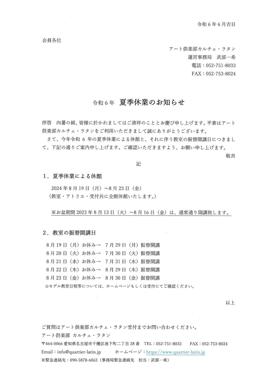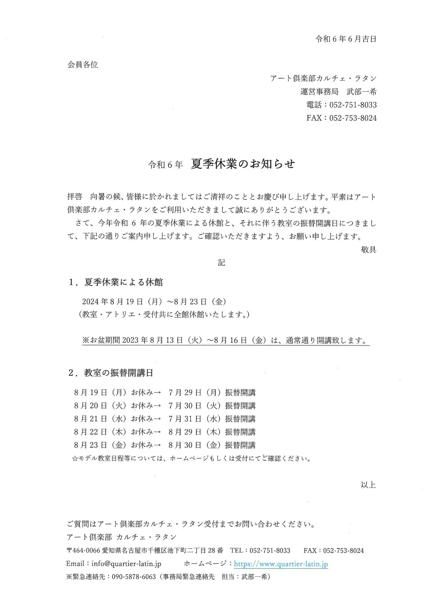令和6年の夏季休業に伴う休館日及び教室の振替開講日につきまして、下記の通りご案内申し上げます。