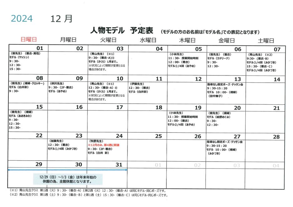 令和6年12月人物モデル教室・人物デッサン会情報 2024/11/05 | 会員様へのご案内 | #人物デッサン #裸婦モデル #着衣モデル #デッサン会 2024年12月の人物モデル教室、指導なしデッサン会スケジュールを掲示します。 教室出席のご参考になさってください。 ※牧野先生の人物モデル教室につきまして、2024年12月は、12/24(第4週の火曜日)に開講いたします。 (12/17の牧野先生クラスが休講となる為) ※モデルの方のお名前は「モデル名」での表記となります。