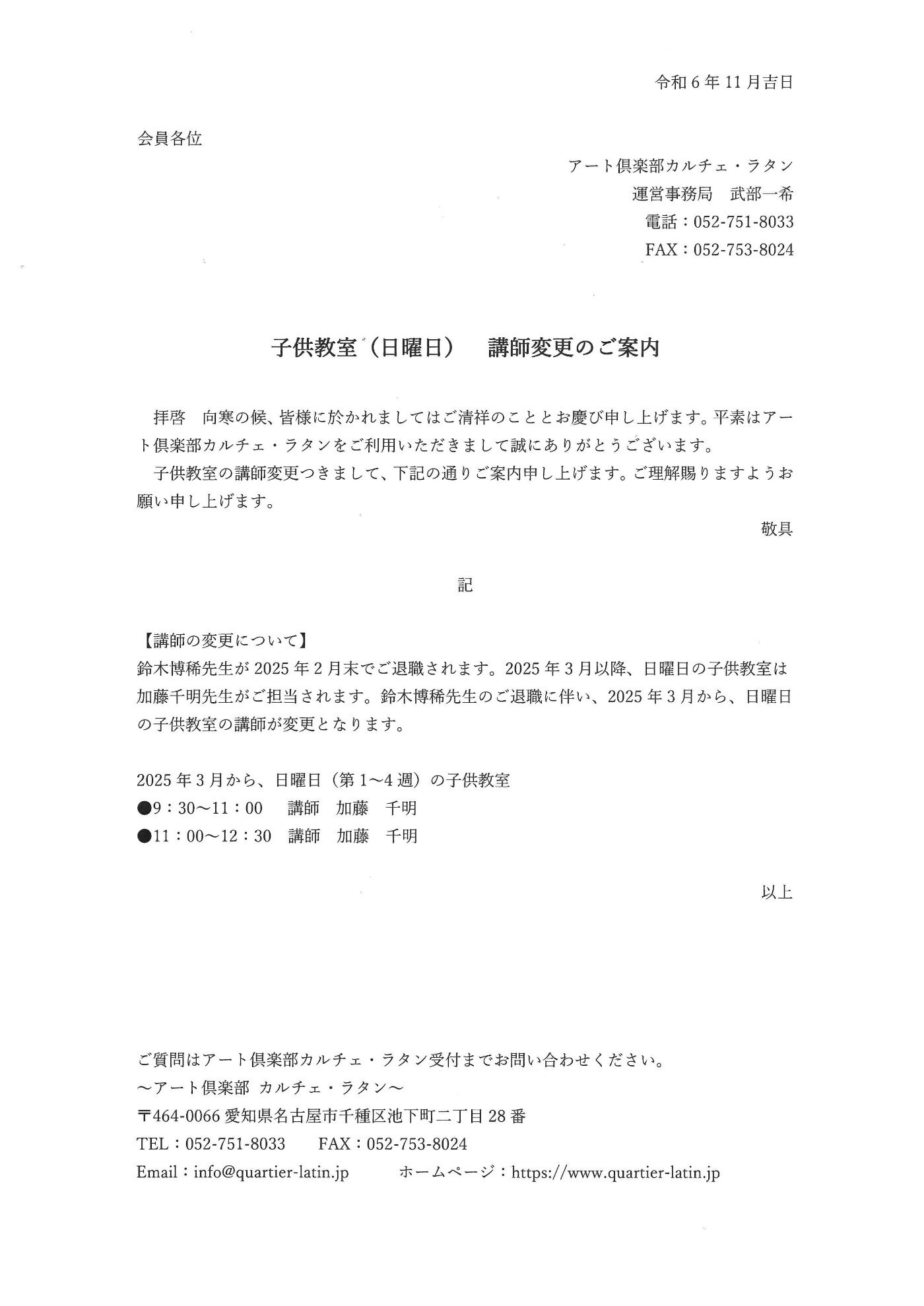 鈴木博稀先生が2025年2月末でご退職されます。2025年3月以降、日曜日の子供教室は加藤千明先生がご担当されます。鈴木博稀先生のご退職に伴い、2025年3月から、日曜日の子供教室の講師が変更となります。